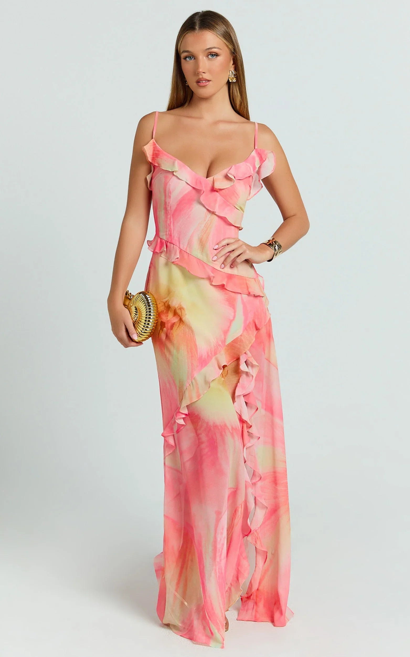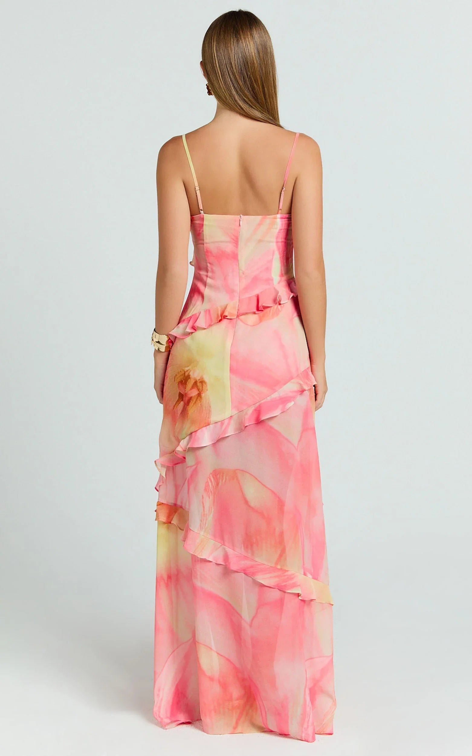 The Adele Maxi Dress in Regency Print brings a strappy V neckline and cascading ruffle tiers that move with every step, hello, twirl factor. The soft pink and feminine print add a romantic flourish, while the elongating silhouette flatters from brunch to the dance floor. Think flirty, flowty, and endlessly wearable for events, date nights, and everything in between. Slip into this maxi for instant main-character energy. Layer on delicate jewellery, then lean into trend-forward styling with sleek cowboy boots or add a fringe-textured accessory for subtle contrast. A pink V-neck ruffle-tiered maxi that nails occasion dressing and day-to-night versatility in one effortless sweep.