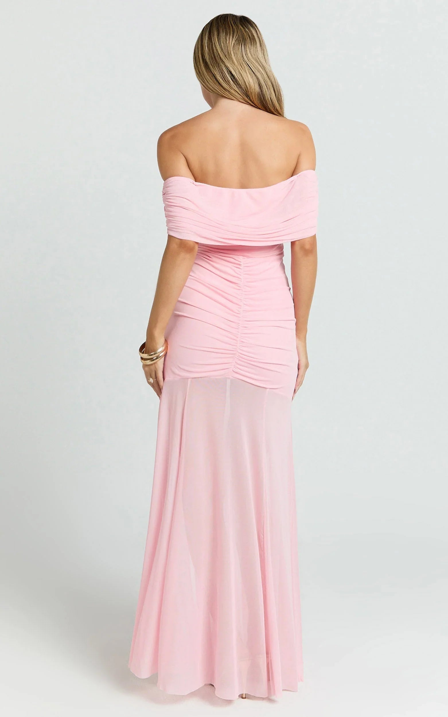 The Alanna Maxi Dress in Pink is that romantic-yet-sexy evening look you save for a big moment. The ruched mesh hugs in all the right places, while the off-the-shoulder neckline gives a soft, feminine frame that feels elegant without trying too hard. Floor-skimming and flattering, she’s made for birthdays, bridesmaid duties, and every after-dark RSVP that deserves something special. The sheer detailing adds just the right hint of drama, and the rosy pink tone is a total glow-up shade on every skin tone. Style it with delicate heels and a micro clutch for a sleek finish, or go bolder with metallic accessories and a glossy lip when you want a little extra spotlight. Romantic, refined, and made to move, this is pink done beautifully.