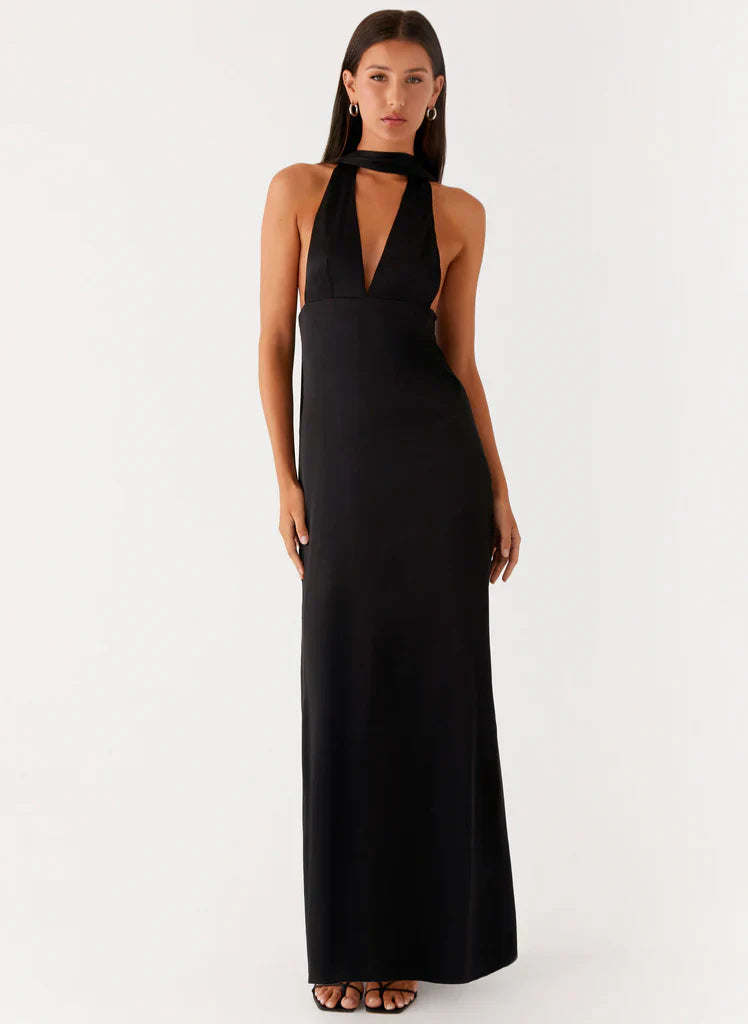 The Alicia Satin Halter Maxi Dress glides through balmy nights with its low V neckline and flowing maxi length. A thick neck scarf and thin adjustable straps frame the low cowl back, while the satin fabric drapes smoothly over the fully lined silhouette. it’s a standout for sunset to sundown soirées.