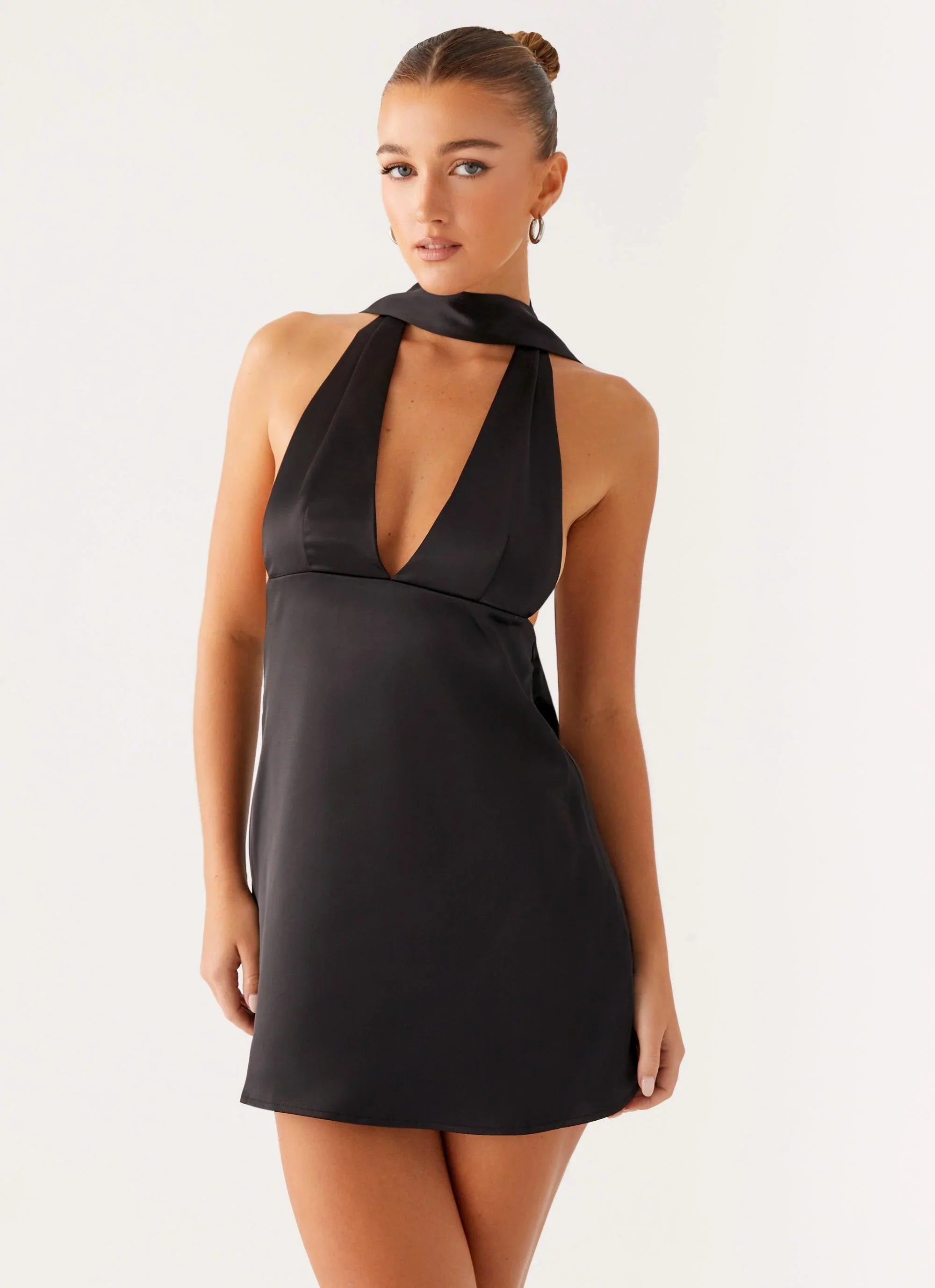 Sultry, sleek, and always unforgettable — the Alicia Satin Halter Mini Dress in Black is made for the night. With a halterneck design and a plunging V neckline, this mini length dress brings all the drama and allure you need after dark.