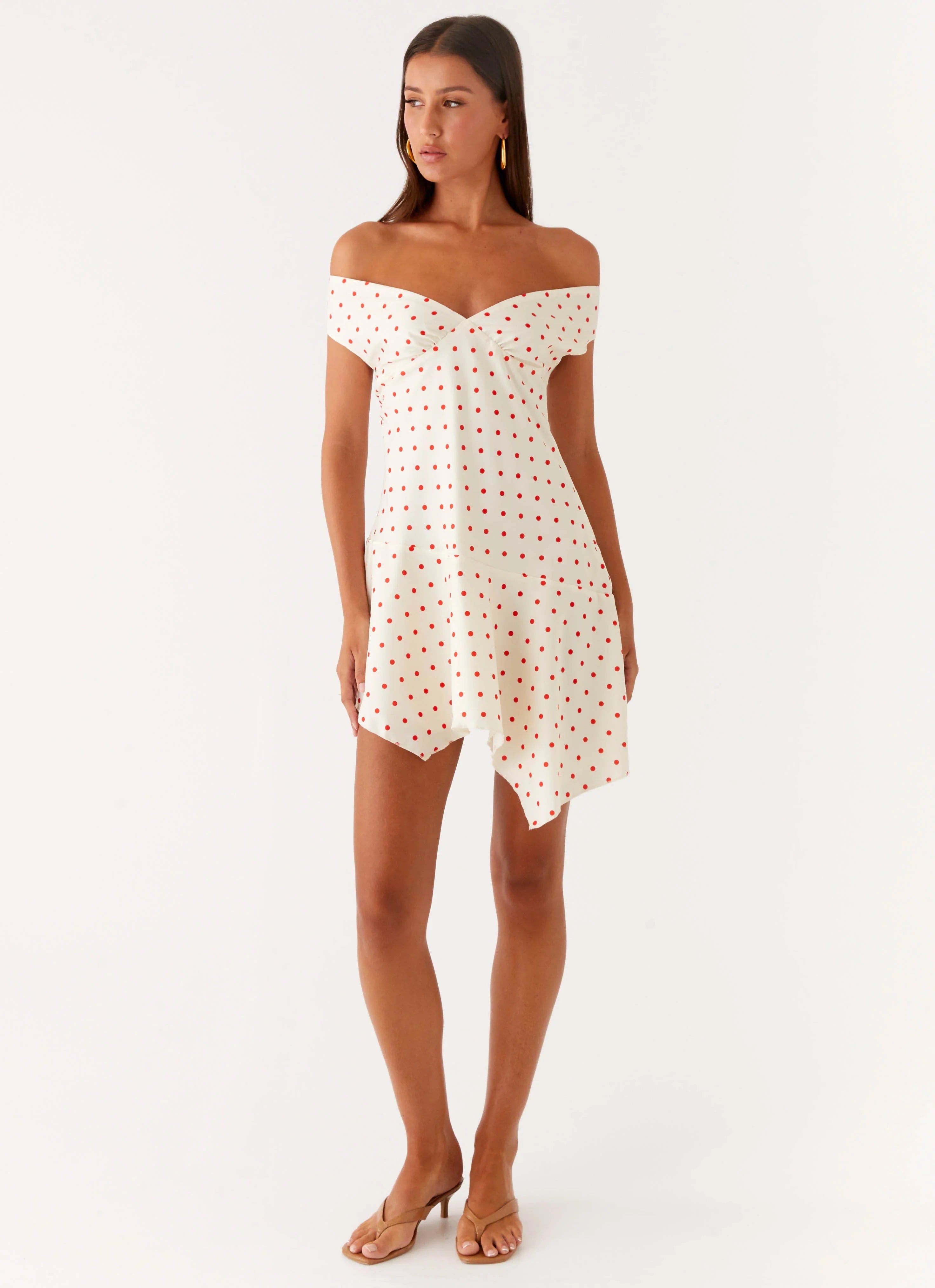 Flirty, fun, and full of movement — the Alma Mini Dress in White Red Polka Dot is made to twirl. With an off-shoulder neckline, drop waist, and flare skirt, it’s your perfect partner for golden hour moments and sultry nights ahead.