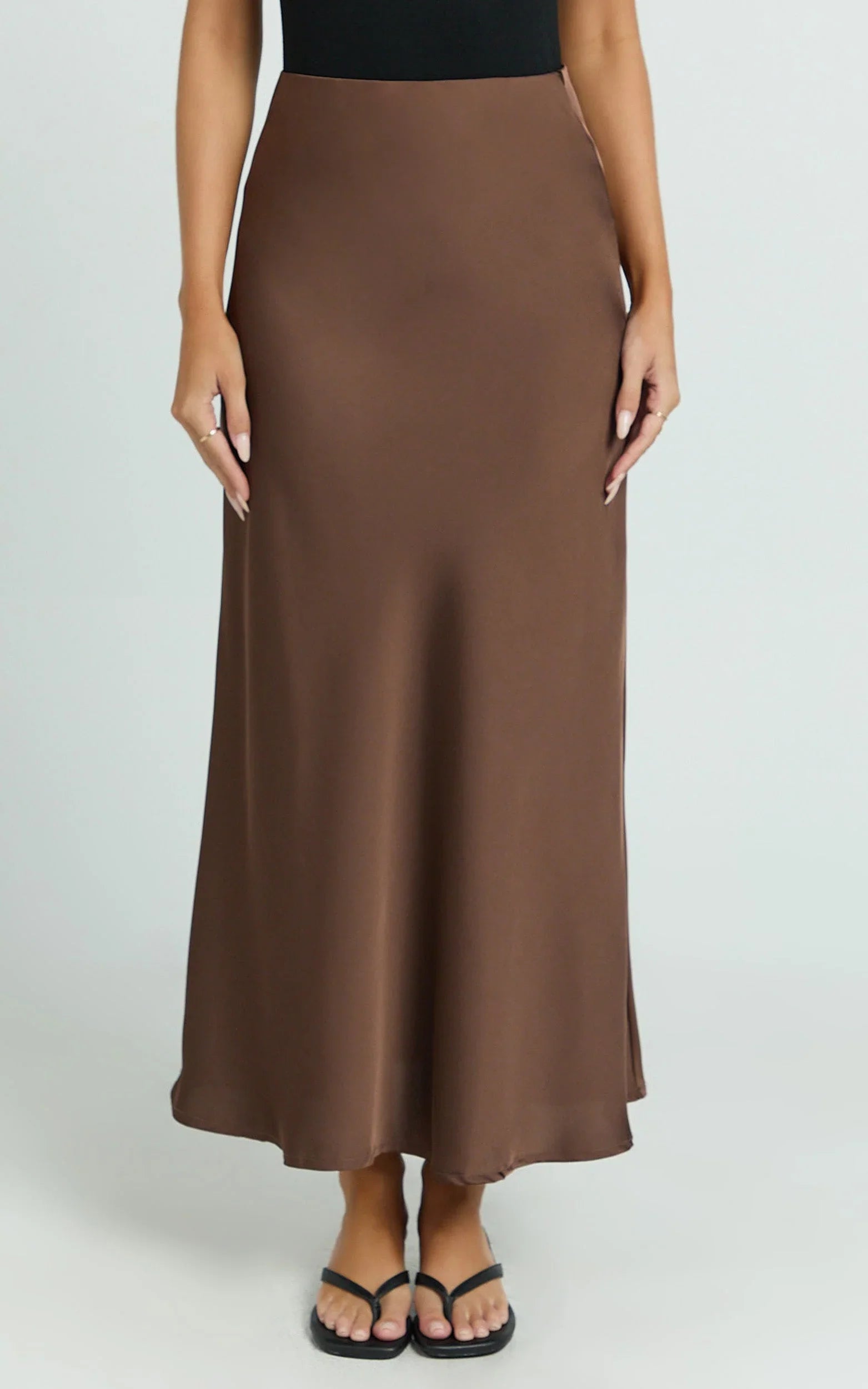 Crafted in a rich chocolate hue, this skirt features a flattering high-waisted fit and bias-cut fabric, perfectly accentuating your curves for a sleek, feminine silhouette. An asymmetrical hem adds playful movement, making each step feel effortlessly graceful and ensuring this maxi skirt stands out from the rest.