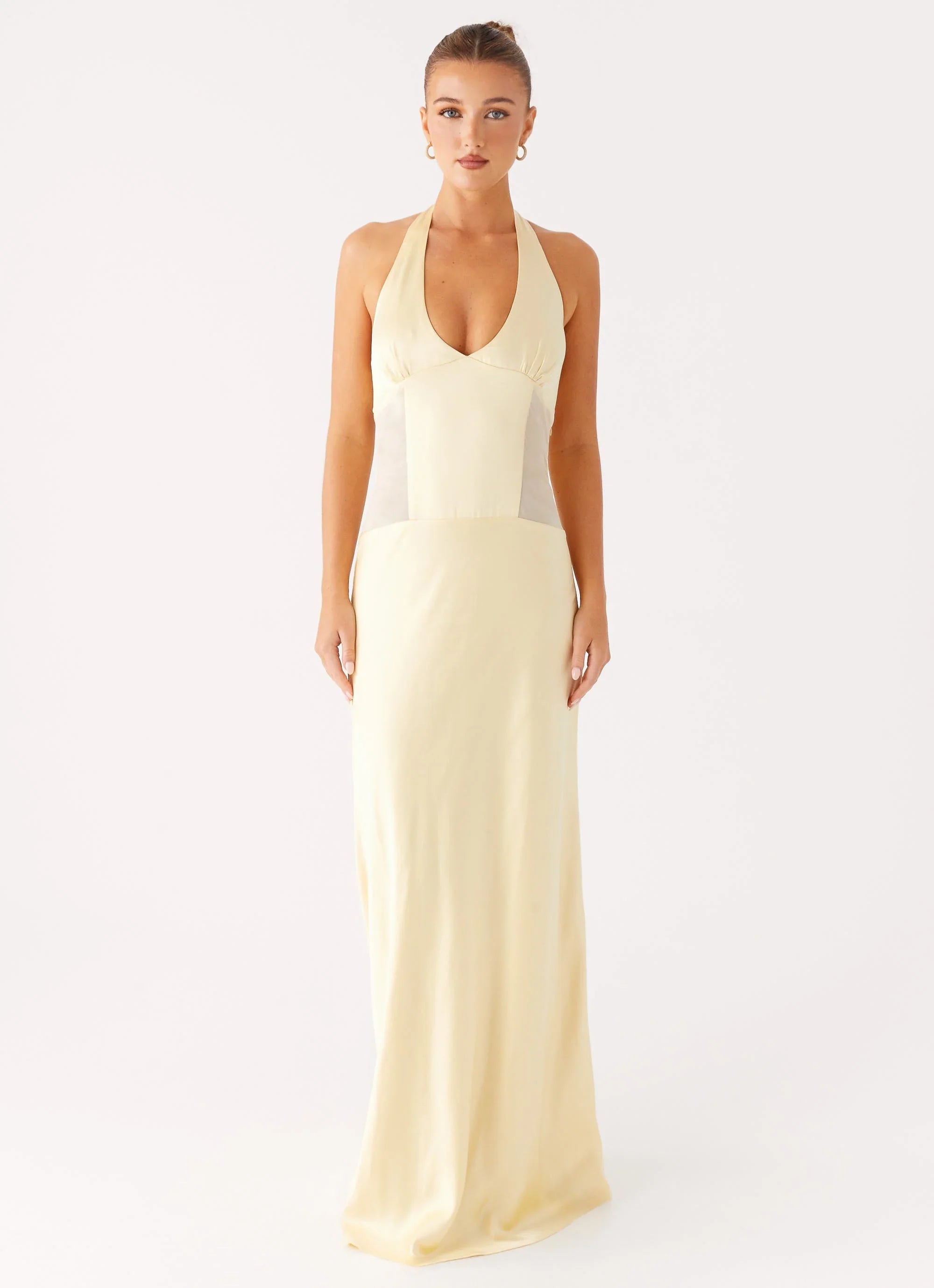 The Ambre Mesh Panel Maxi Dress is a statement silhouette with soft, sultry details. Featuring a halter neckline and ruched underbust for a flattering fit, it’s designed with semi-sheer side panels to elevate the allure. Fully lined for comfort, this maxi is your go-to for evening elegance.