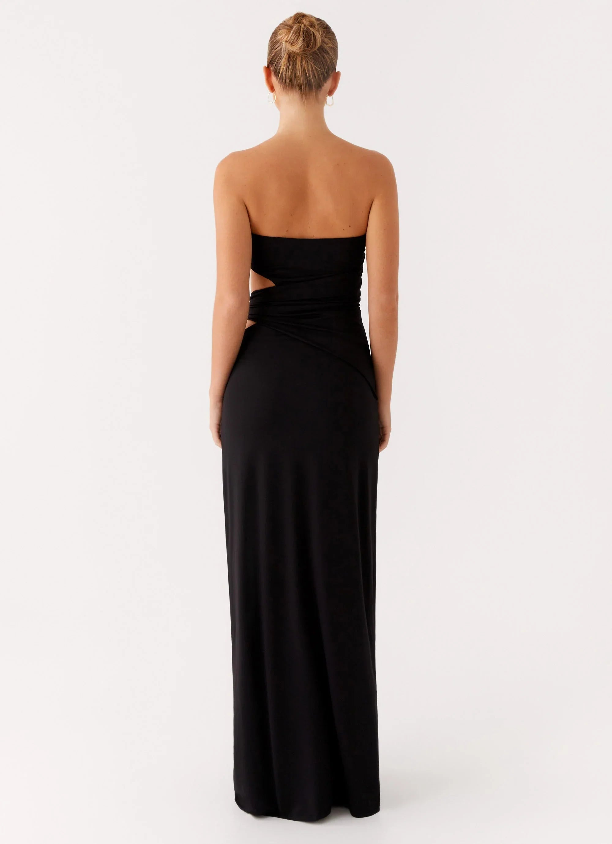 Elegant and contemporary, the Anetta Maxi Dress boasts a strapless neckline, side cutouts, and ruched detailing with metal embellishments, all crafted in stretch jersey for a figure-flattering fit.