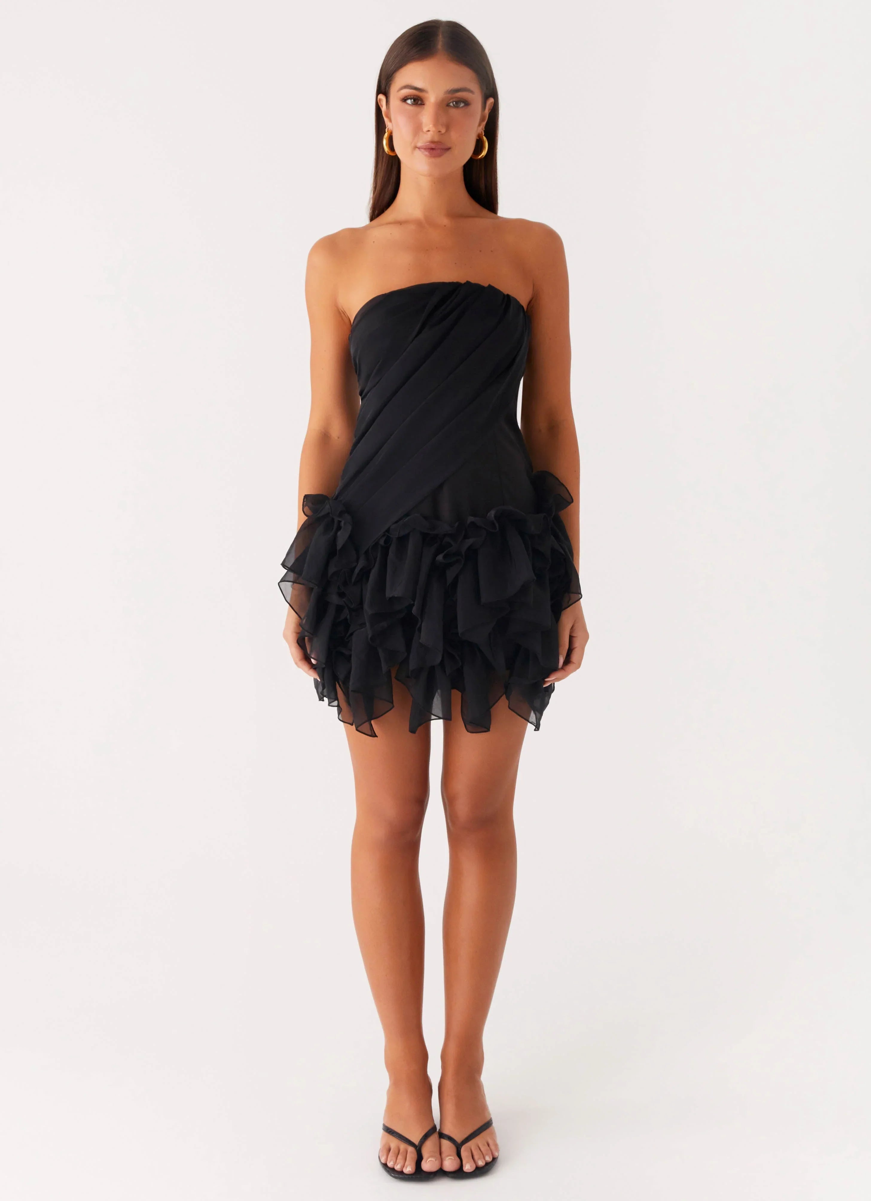 The Arabian Nights Mini Dress is your go-to for an effortless after-dark statement. Featuring a strapless neckline and pleated bodice, it falls into a tiered ruffled skirt for a playful silhouette. Fully lined with a hook-and-eye and invisible zip closure at the back.