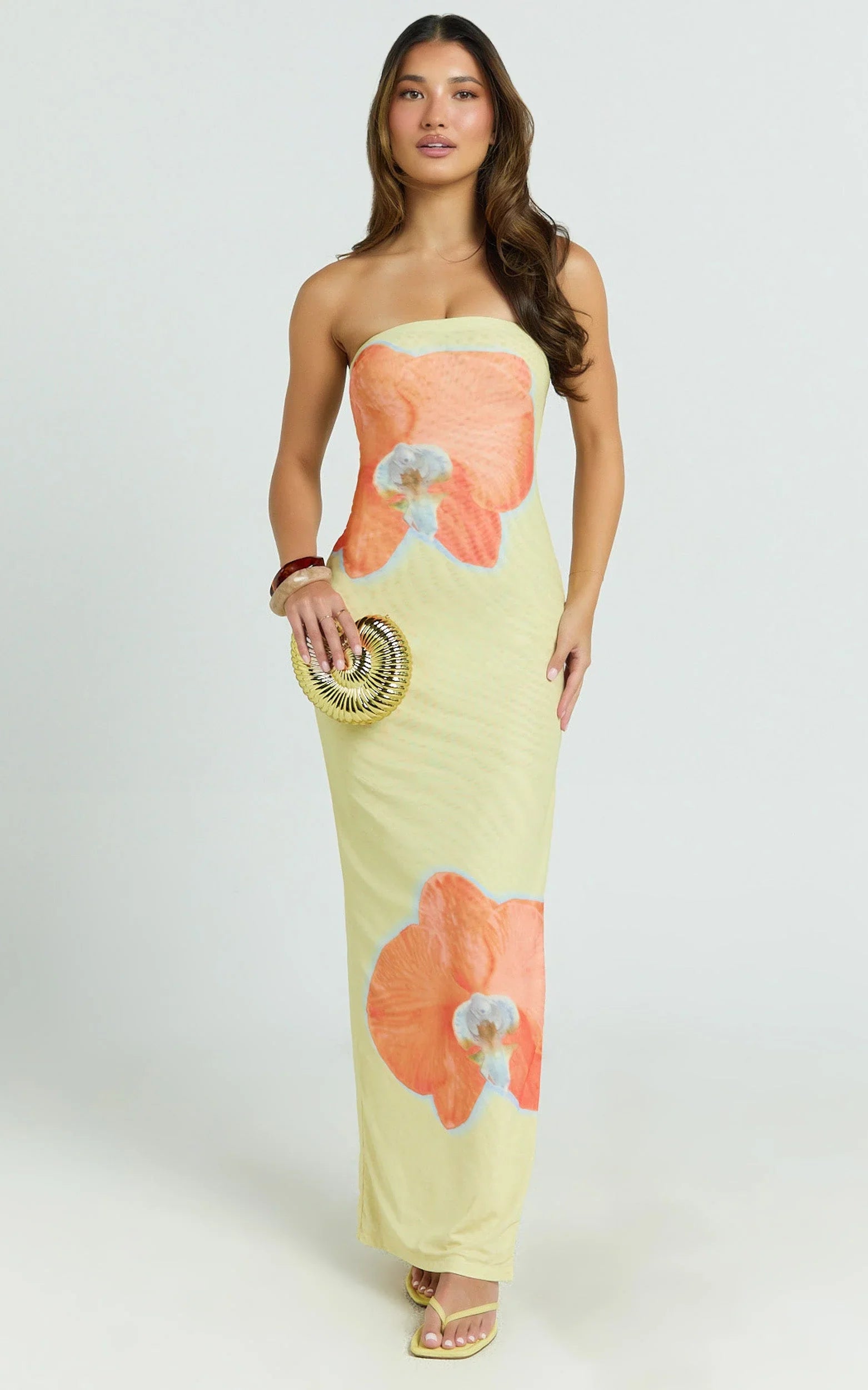 Crafted with an effortlessly flattering strapless neckline and a fitted silhouette that perfectly hugs every curve, this dress features a bold orchid print in vivid yellow hues guaranteed to turn heads. Chic mesh detailing adds texture and intrigue, making it an ideal choice for weddings, cocktail parties, or weekend brunches.