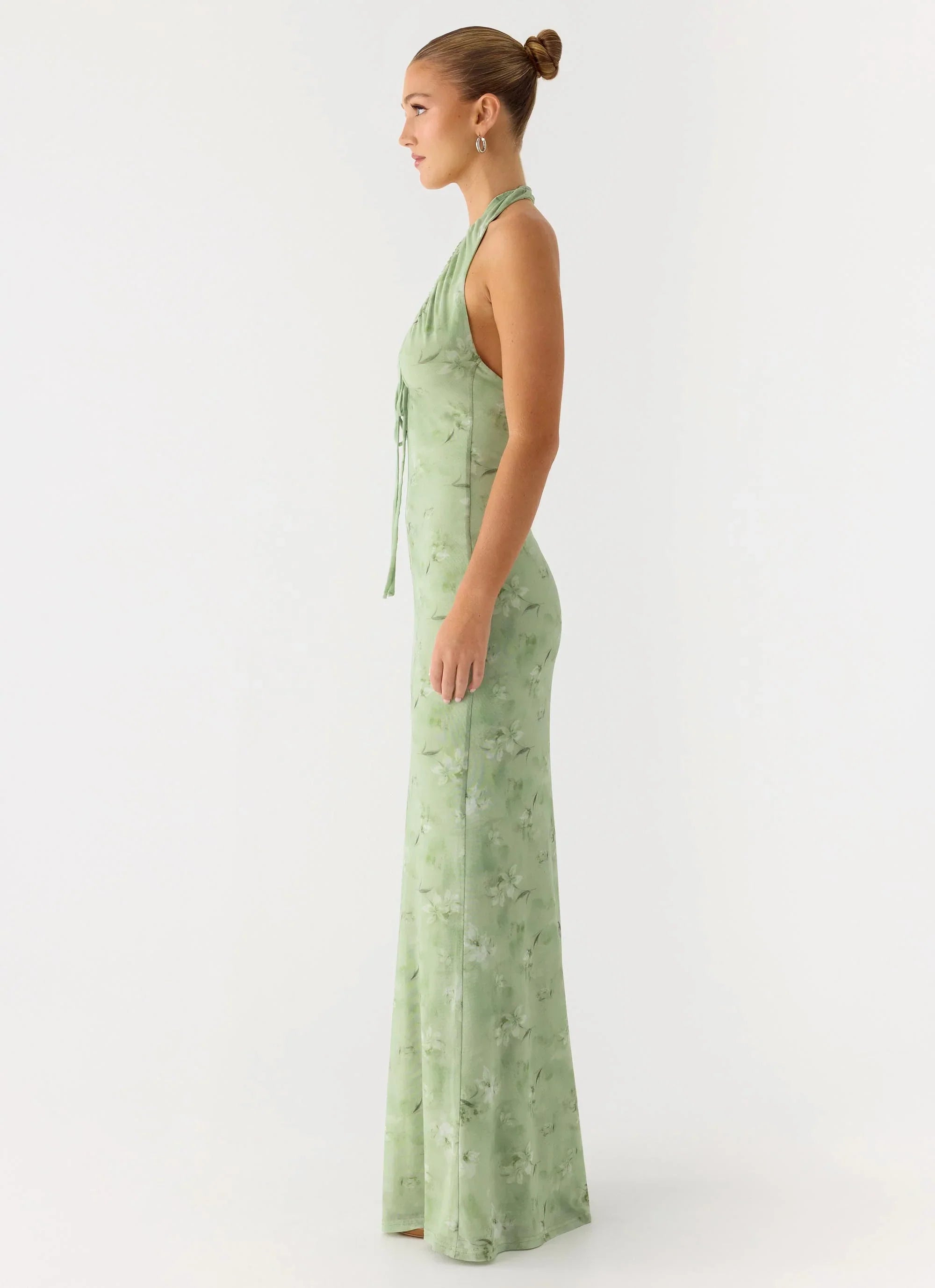 The Ask You Twice Maxi Dress is made for sun-soaked days and warm evening soirees. Featuring a V-neckline with ruched detail, front tie, and halter neck, its body-hugging maxi-length silhouette flatters the figure while offering effortless movement.