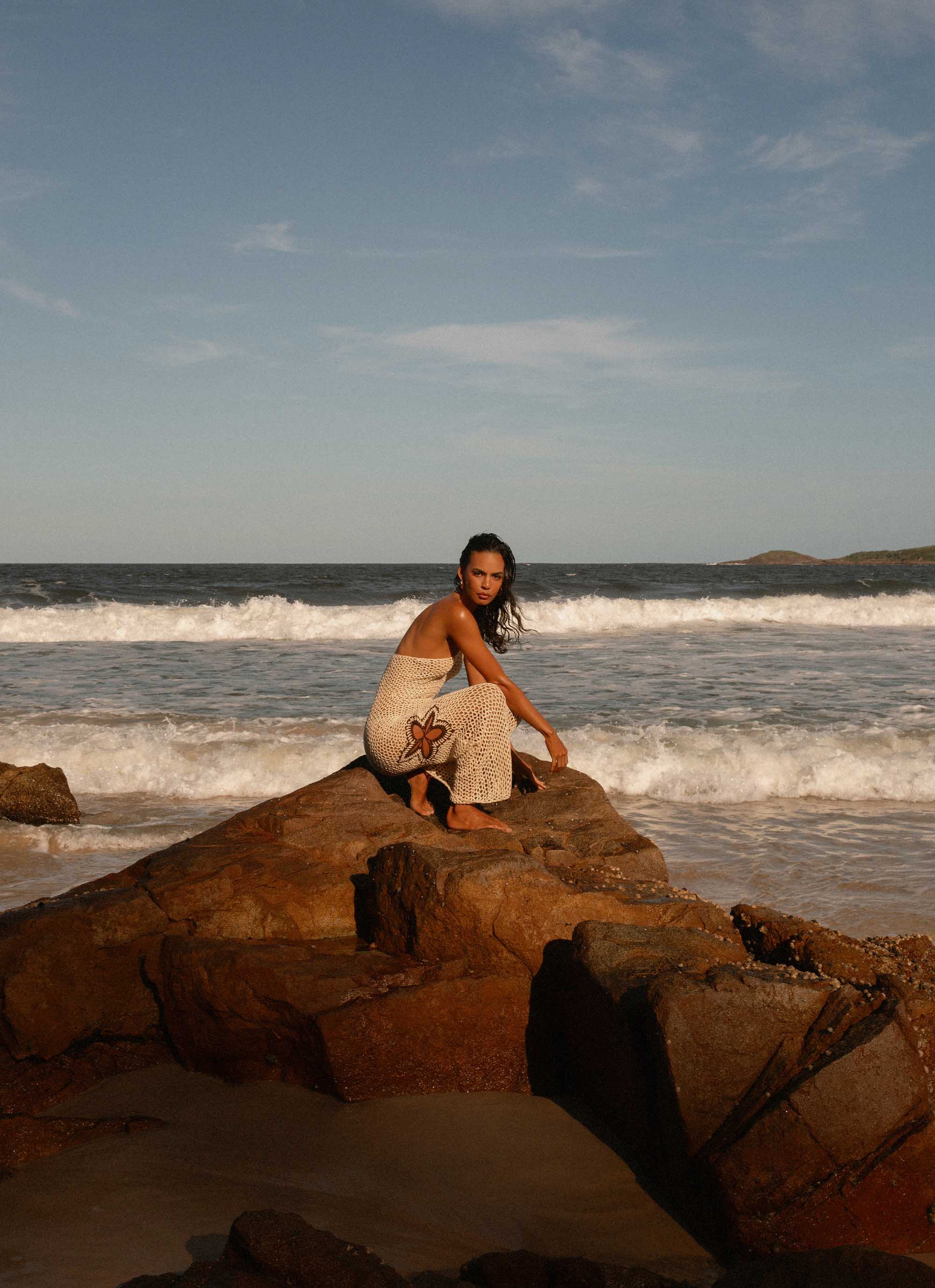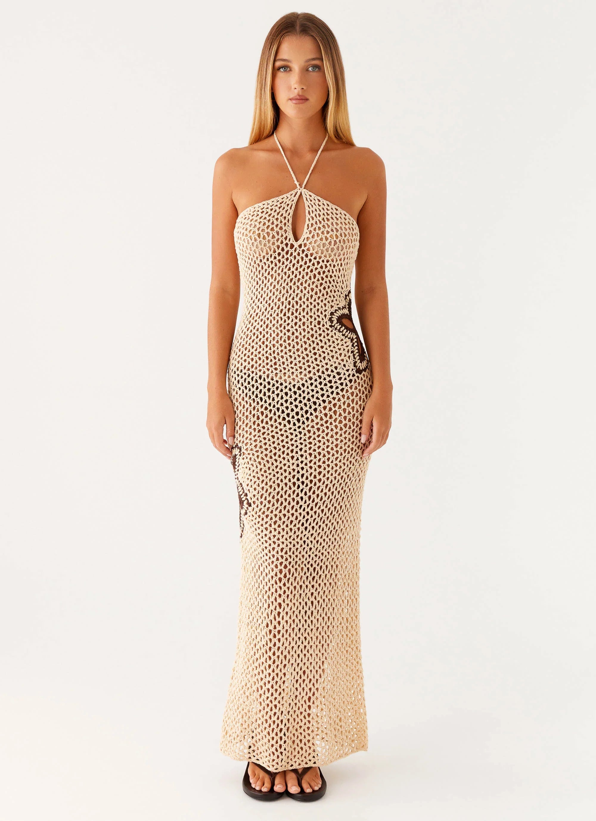 Introducing the Aster Crochet Maxi Dress. With a chic halter neckline, stretch crochet material, and a semi-sheer finish, this maxi dress exudes effortless elegance and sultry allure, perfect for moonlit moments and golden hour vibes.