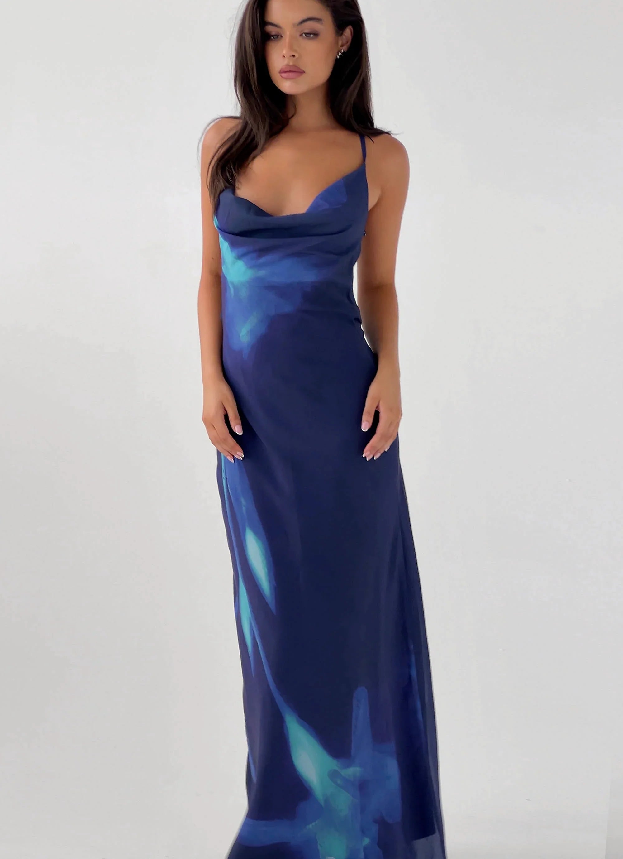 The Astra Maxi Dress: Designed for those who come alive in the PM. This stunning dress features a cowl neckline and semi-sheer design, along with our exclusive "Cyber Rose" print. Perfect for embracing balmy nights and captivating nightclub silhouettes.