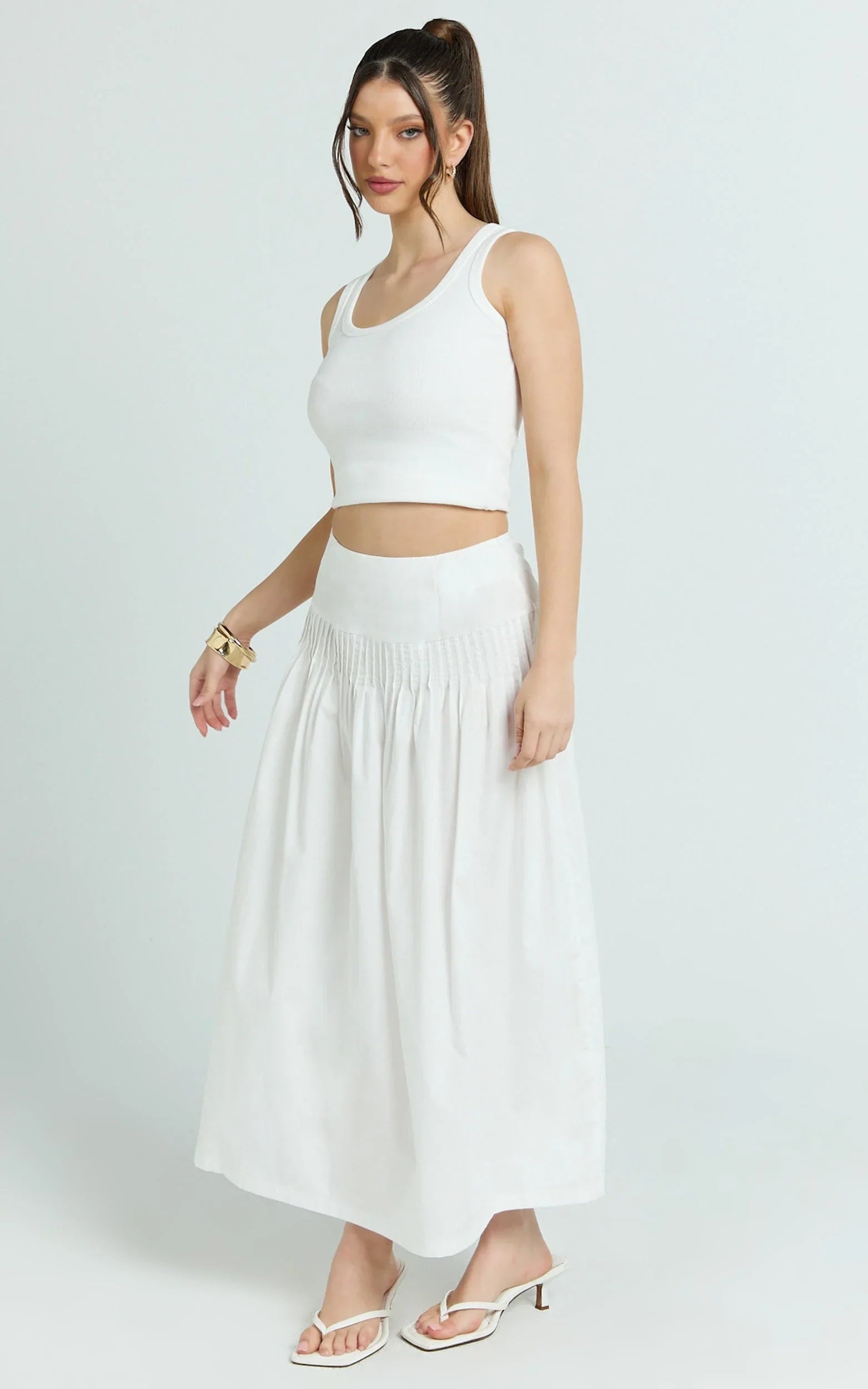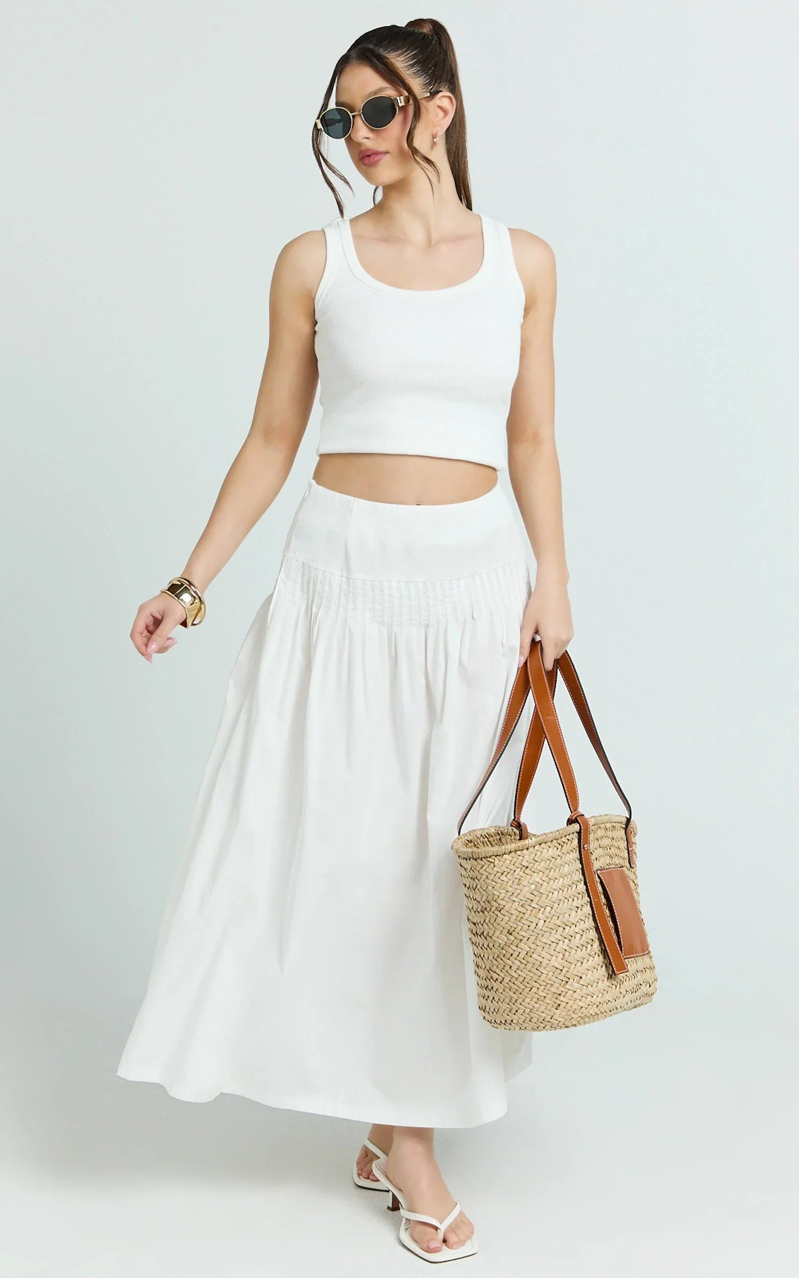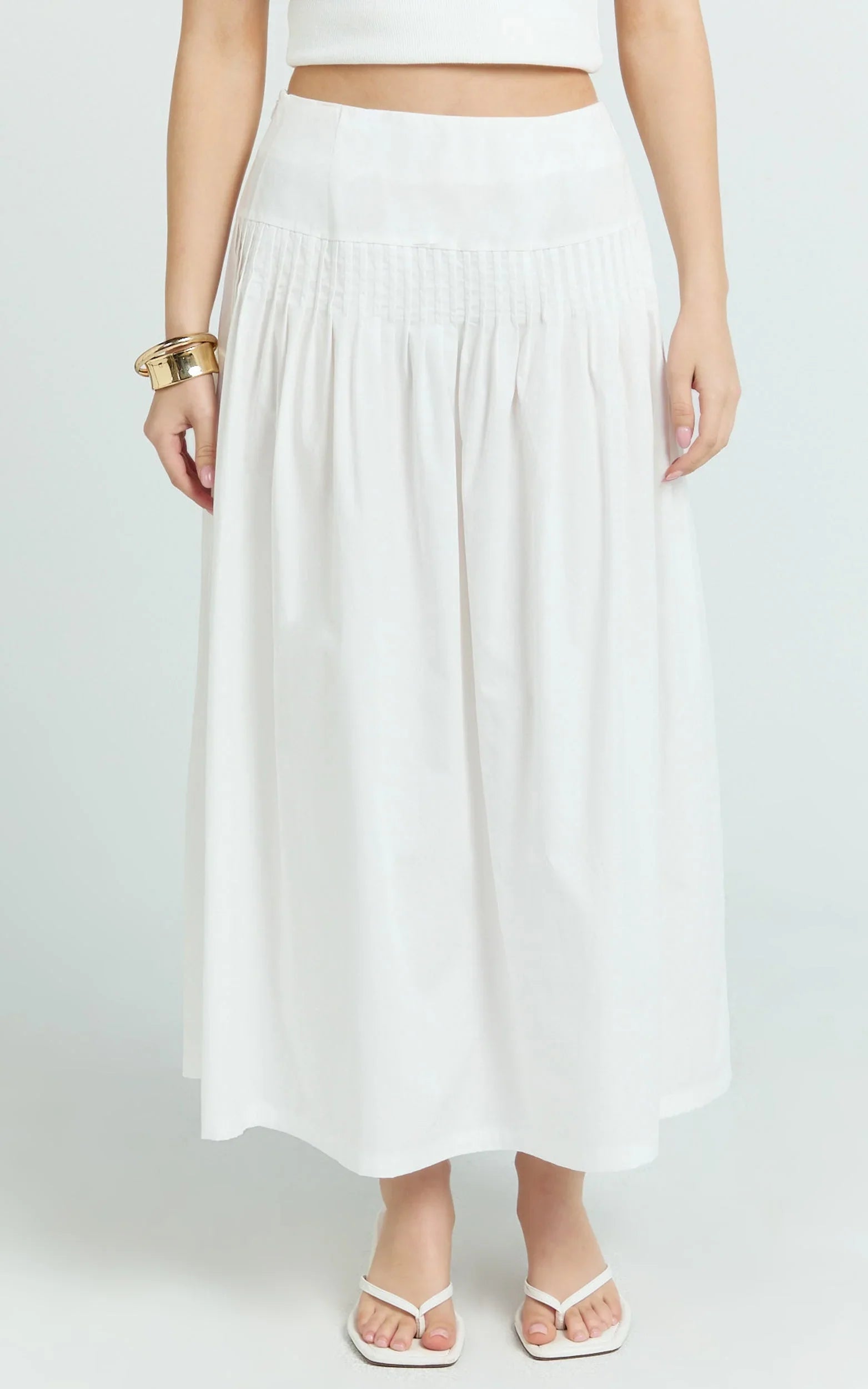 Say hello to Auburn, your new go-to for brunch to after-dark. Style the Auburn Maxi Skirt - Poplin Pintucked A Line Skirt In Ivory with a fitted crop, sleek bodysuit or a softly draped blouse for statement layering, then finish with strappy heels or tonal mules. It’s a refined essential that teams beautifully with neutrals, or pops next to cobalt blue for a fresh, fashion-forward contrast.