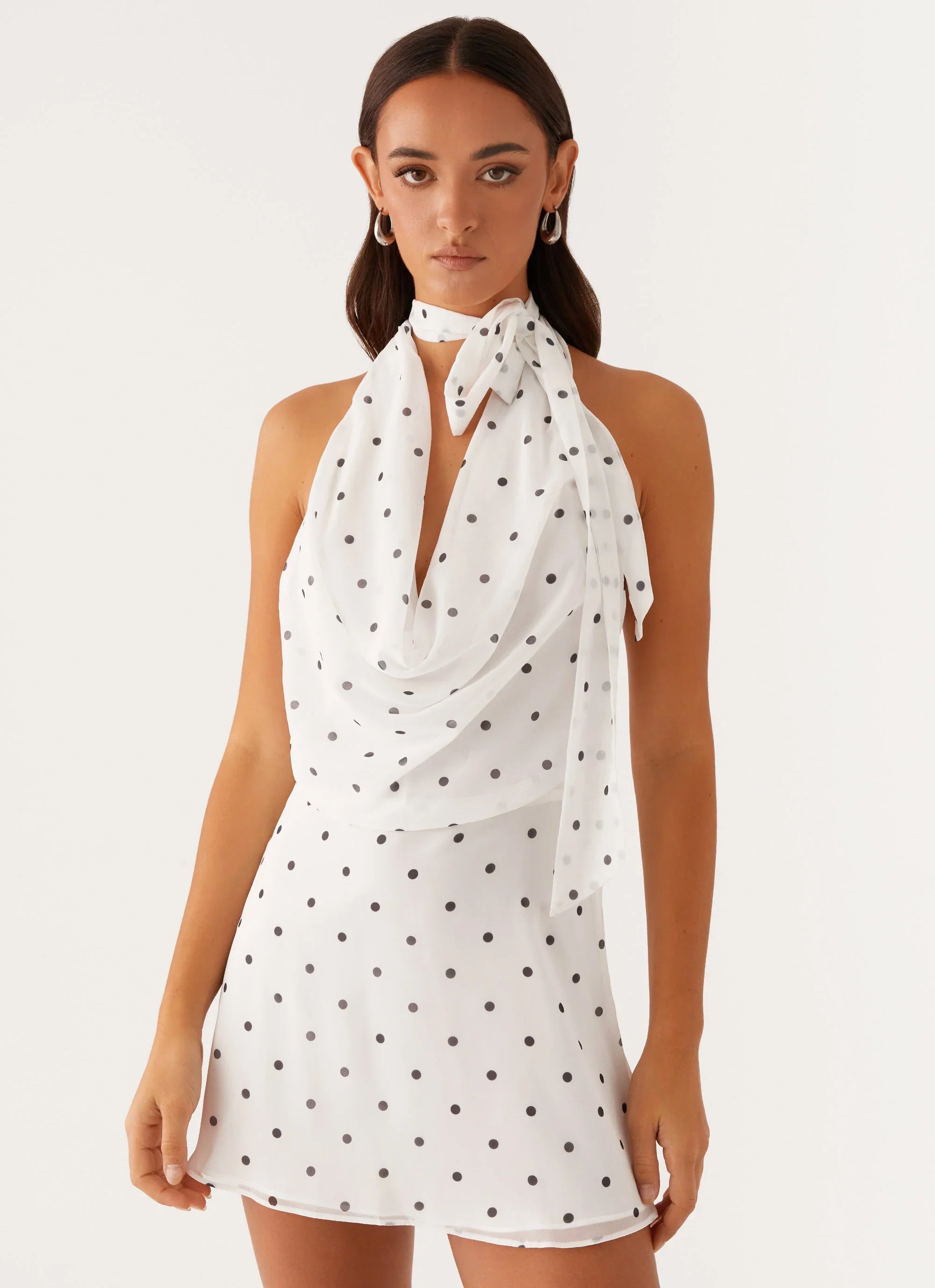 The Avalia Backless Scarf Mini Dress exudes effortless glamour with its stunning front cowl neckline and daring open back. Designed with a chic neck tie, this dress flatters every curve while adding a playful touch. Perfect for those balmy nights, this mini dress is your go-to for making a statement wherever you go.