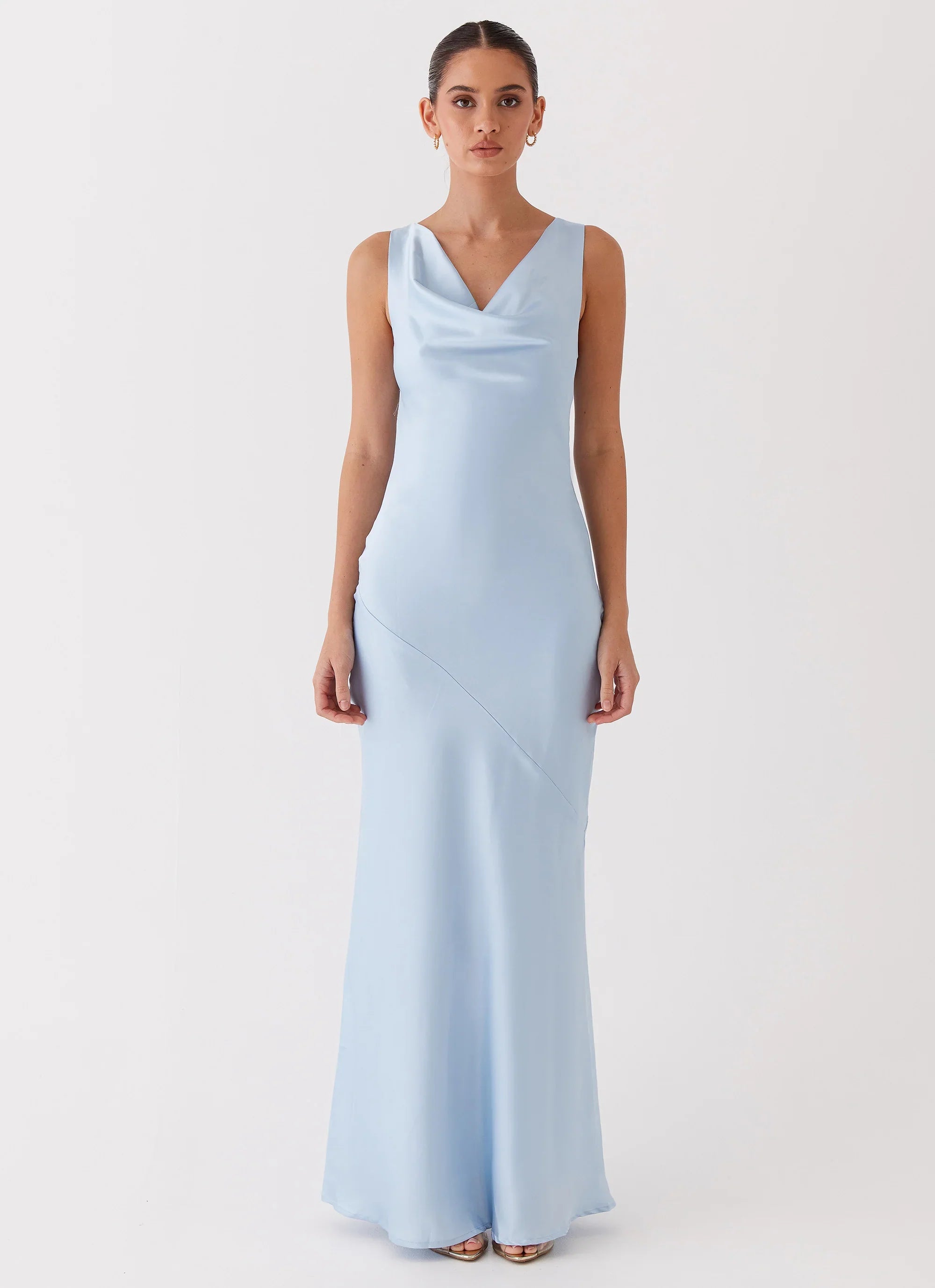 Introducing the Be Mine Satin Maxi Dress in blue. With its draping silhouette and glamorous cowl neckline, it's designed to elevate your elegance from sunset to sundown.