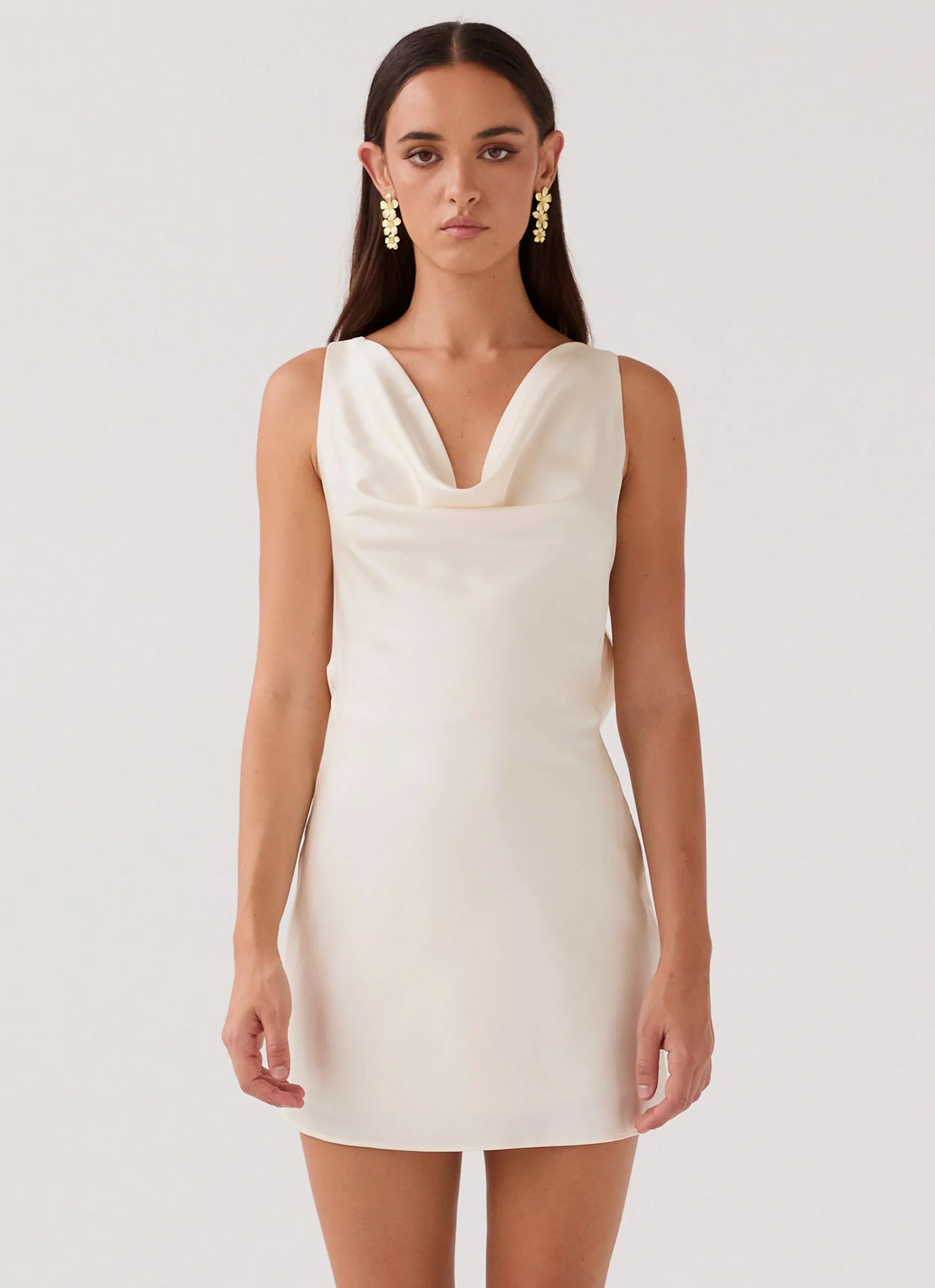 Introducing the Be Mine Satin Mini Dress. It's lightweight, draping silhouette and glamorous cowl neckline, elevate your elegance from sunset to sundown. Perfect for embracing golden skies, balmy nights, and creating unforgettable nightclub silhouettes at your next event.