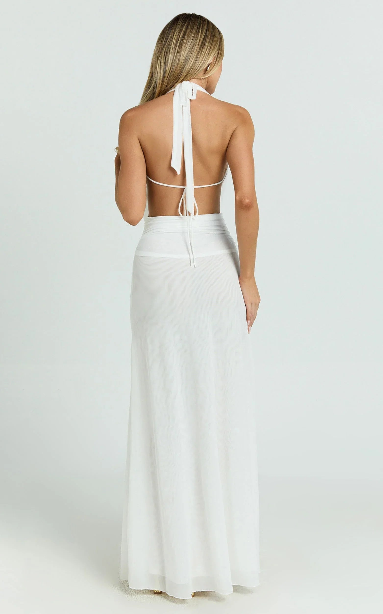 A low cowl neckline and halter tie bring sultry balance to the sleek bodycon silhouette, while the sweeping length leans into quiet luxury for any dressy affair. Effortlessly versatile in the Dresses lineup, it’s the kind of piece that photographs beautifully and moves with you from cocktail hour to late-night plans.