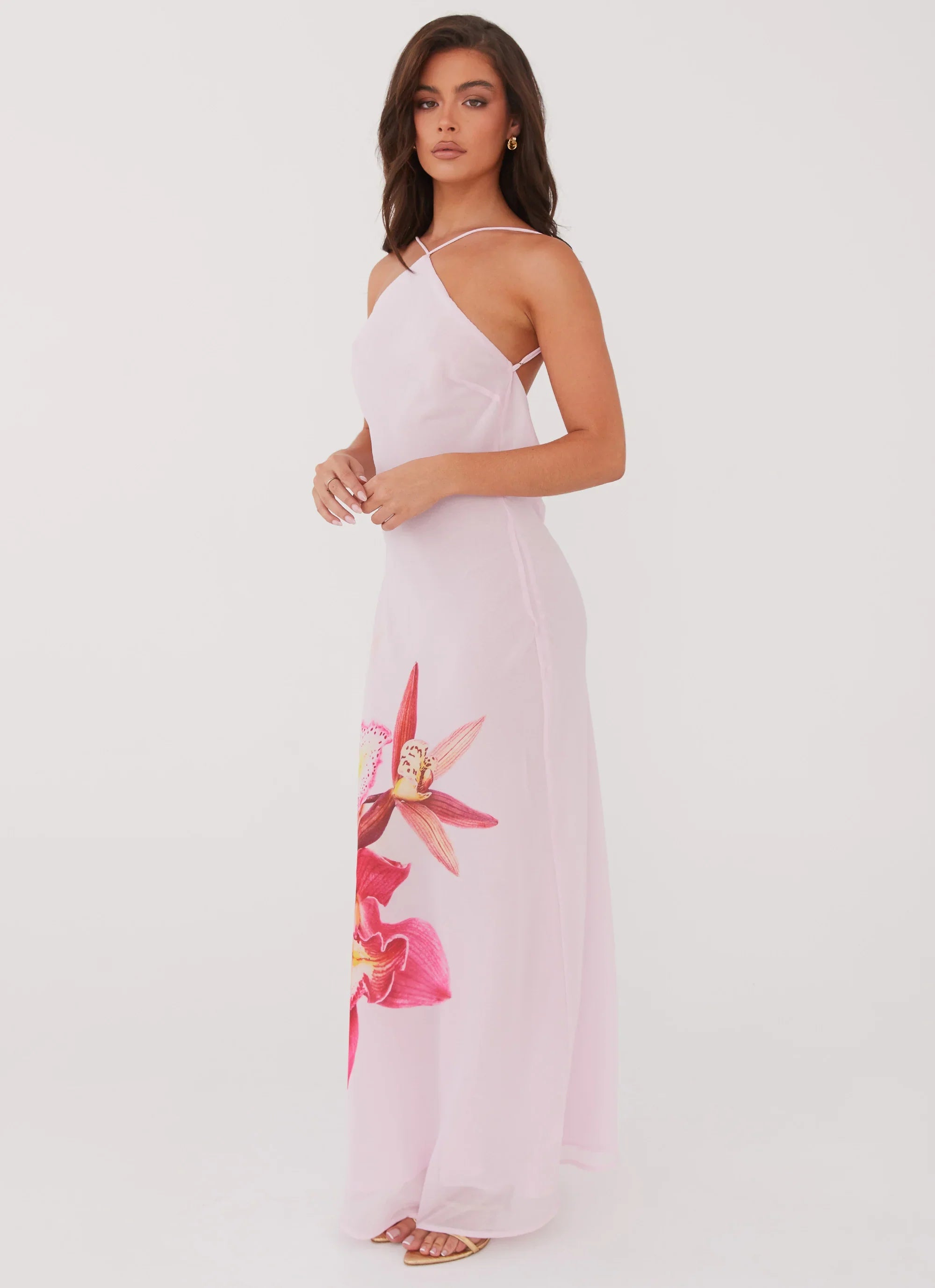 Elevate your evening ensemble with our Blossom Hearts Maxi Dress. Boasting a flattering bias cut, chic halter neck, and sultry low back. Pair it with kitten heels and a sleek saddle bag for a captivating look that commands attention. Perfect for embracing golden skies, balmy nights, and nightclub silhouettes.