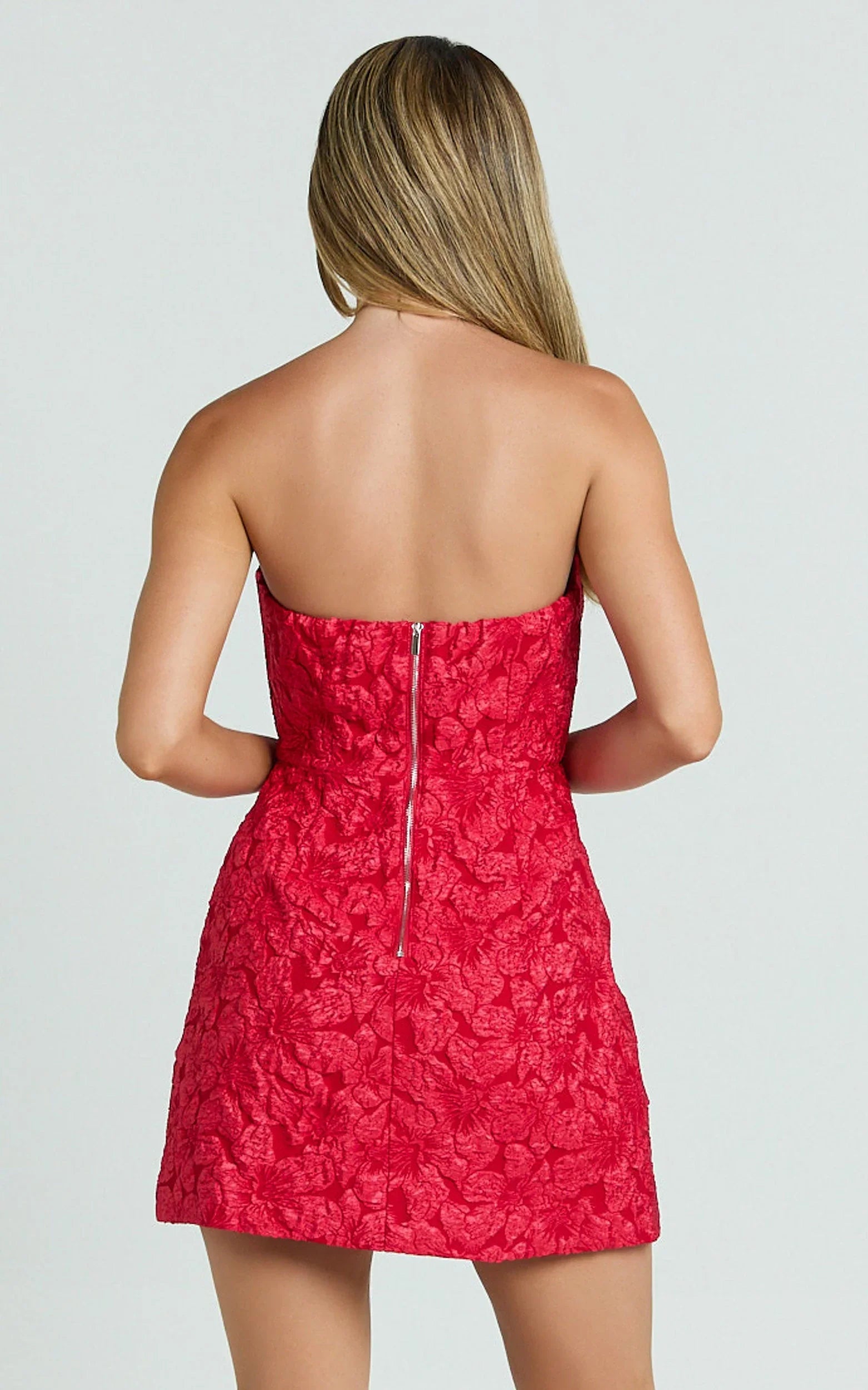 Featuring a strapless cut and striking red jacquard fabric, this dress effortlessly hugs your curves and adds a playful touch of runway-ready glamour. With its maximalist style and attention-grabbing appeal, the Brailey is your go-to choice for sunset cocktails or turning heads at any event.