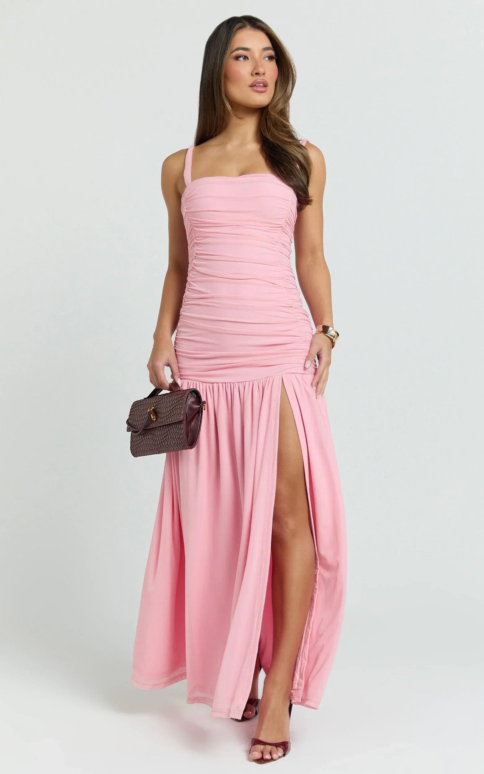 In a flirty pink hue, this ruched mesh number is designed to hug your curves in all the best ways, while that high leg split dials up the drama for instant wow-factor.