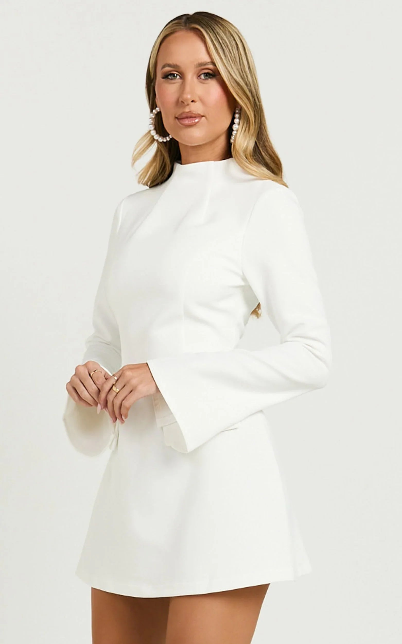 Carlson Mini Dress - High Neck Sleeve Cocoon Skirt Dress In White levels up your look with subtle sculptural volumes and a sleek finish that pairs perfectly with metallics or minimalist sandals for that glossy, pulled-together vibe. Add metallic sunglasses for a cool edge, or keep it refined with pared-back accessories, either way, it’s a standout piece that keeps the focus on you.