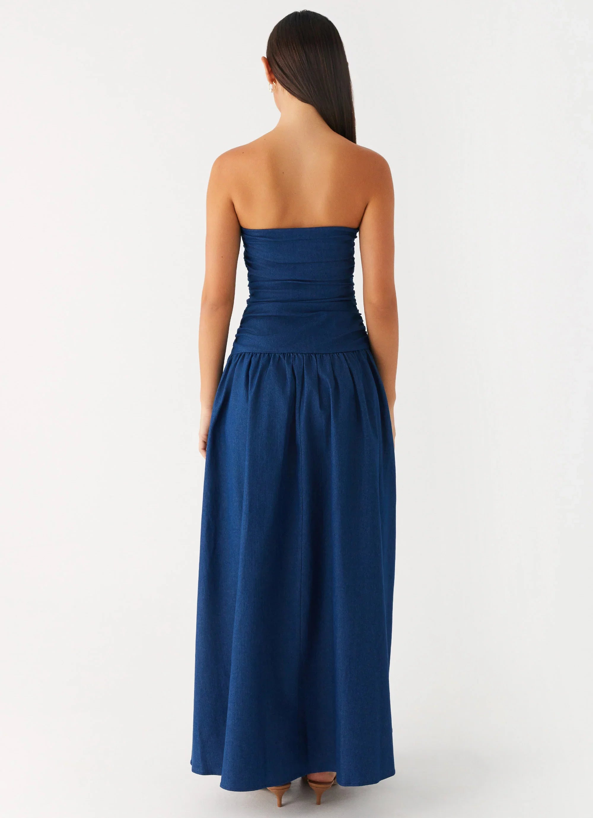 The Carmel Denim Maxi Dress is bold and stylish. Featuring ruched sides, a drop waist, and a strapless neckline, it’s designed to flow effortlessly from golden skies into nights filled with unforgettable moments.