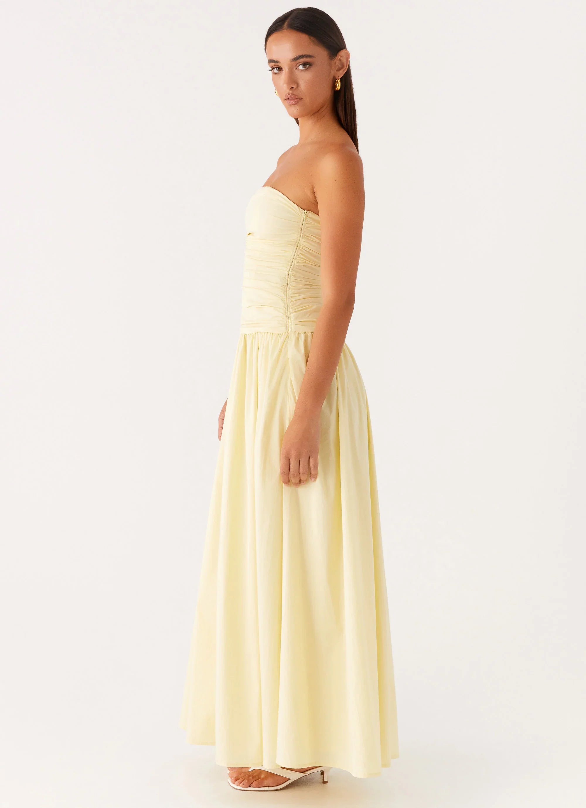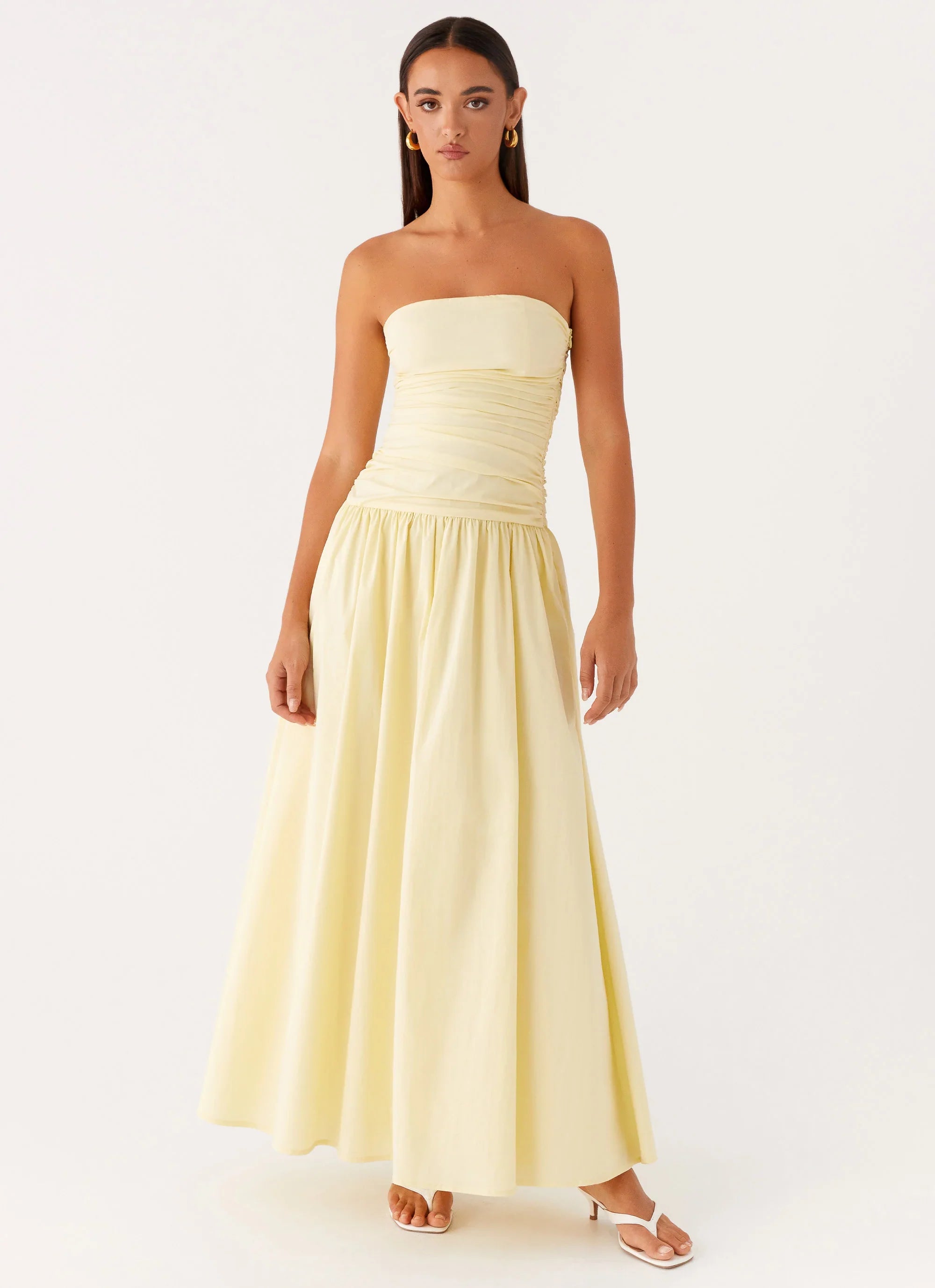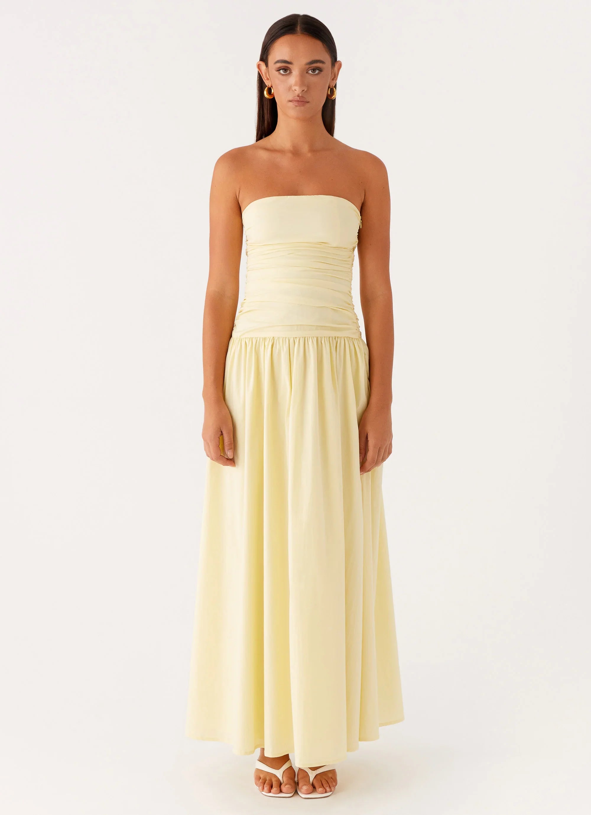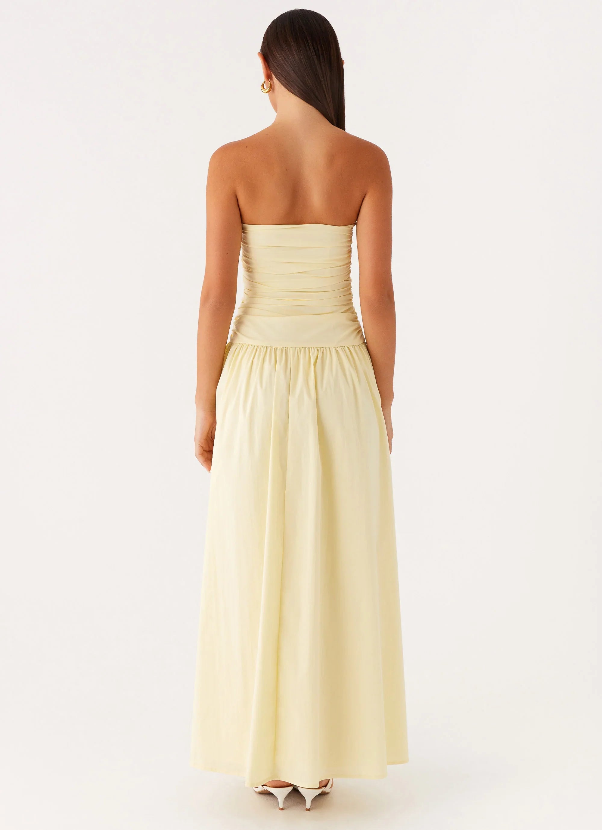 Carmel maxi dress. A flowing silhouette with a strapless neckline that glides over the body, designed to move effortlessly from golden hour to midnight allure.