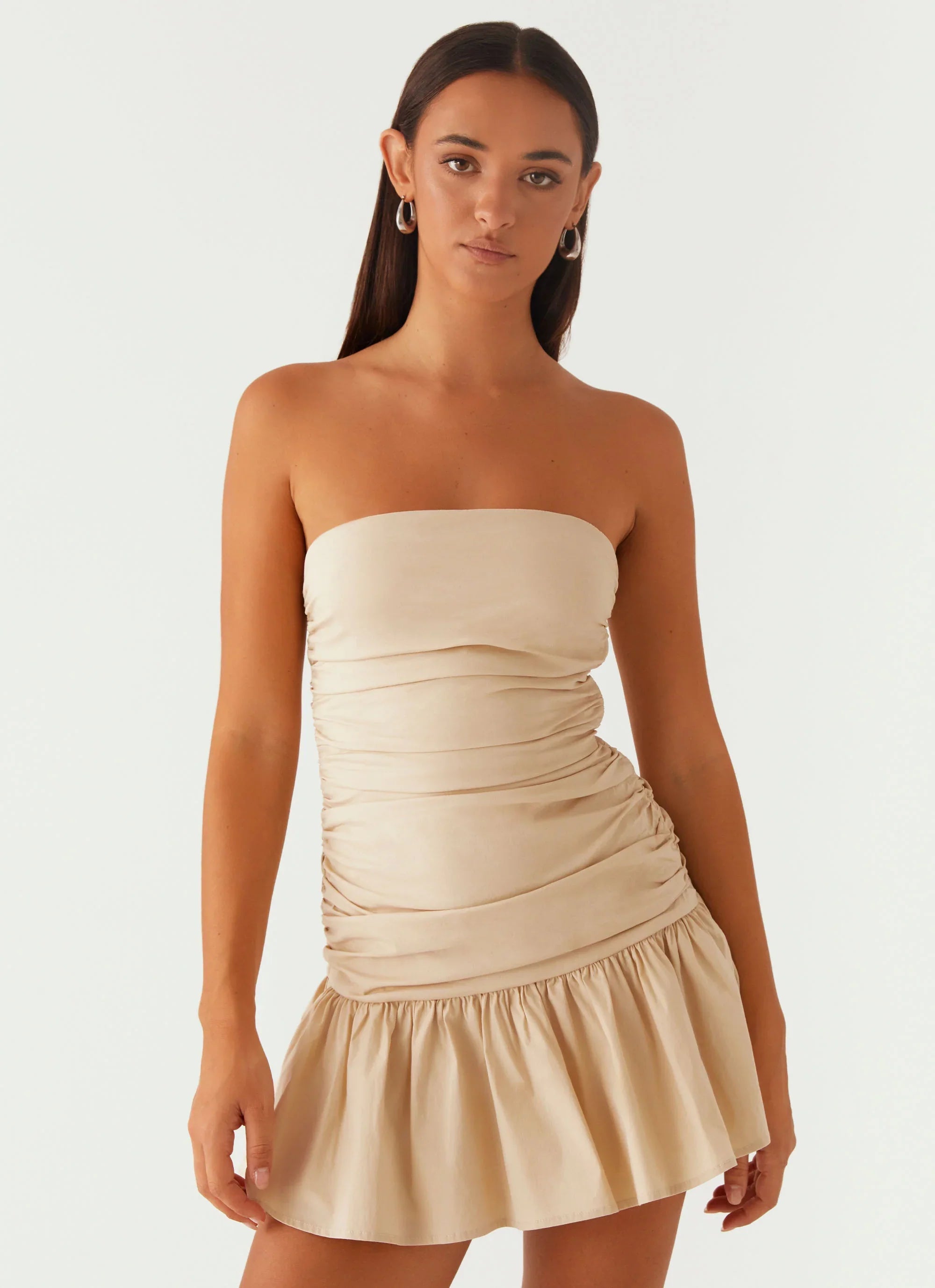 The Carmel Mini Dress is a playful twist on elegance. Featuring a strapless neckline, ruched sides, and a flared skirt, it’s designed to move with you under golden skies and turn heads through every unforgettable moment.