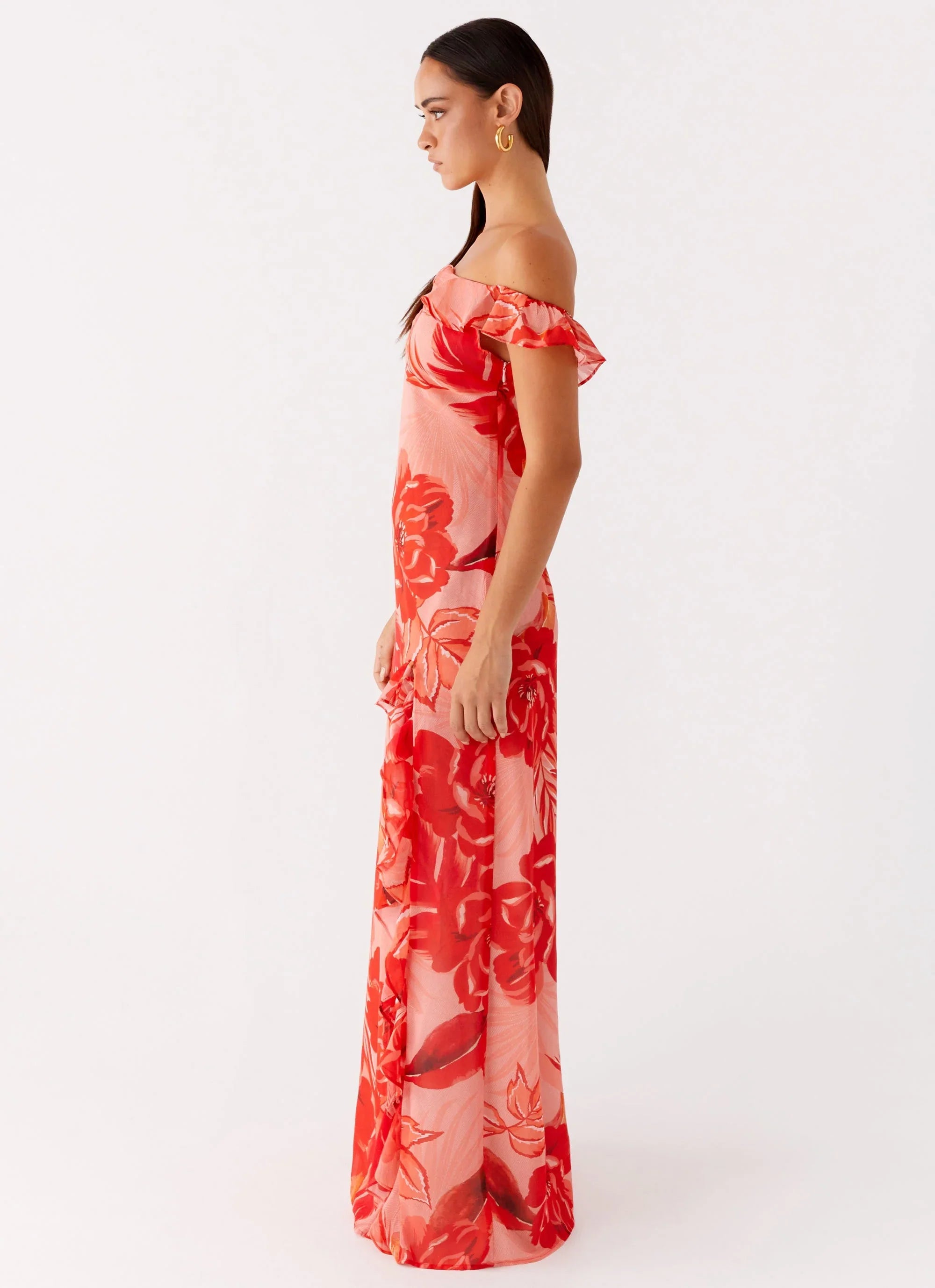 Soft skies and softer silhouettes — the Cassiday Maxi Dress in Sicily Sunsets floats with you into the night. Featuring an off-the-shoulder neckline with delicate ruffle detailing, this maxi length beauty is made for golden hour moments and after-dark escapes.