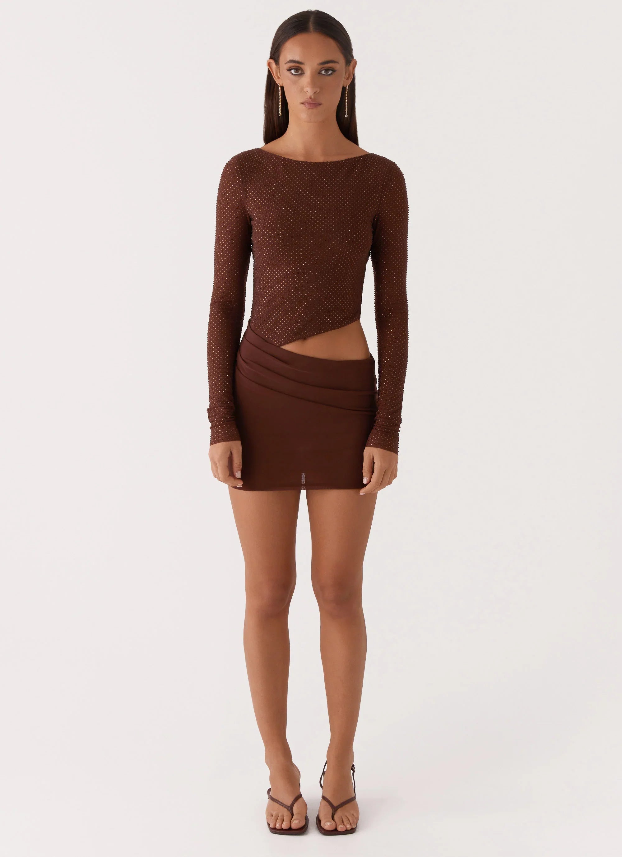 The Catch The Night Long Sleeve Mini Dress is designed with a classic true-neckline and dazzling beaded material that shimmers under the lights. Its mini length and sleek long sleeves create an elegant, party-ready silhouette.