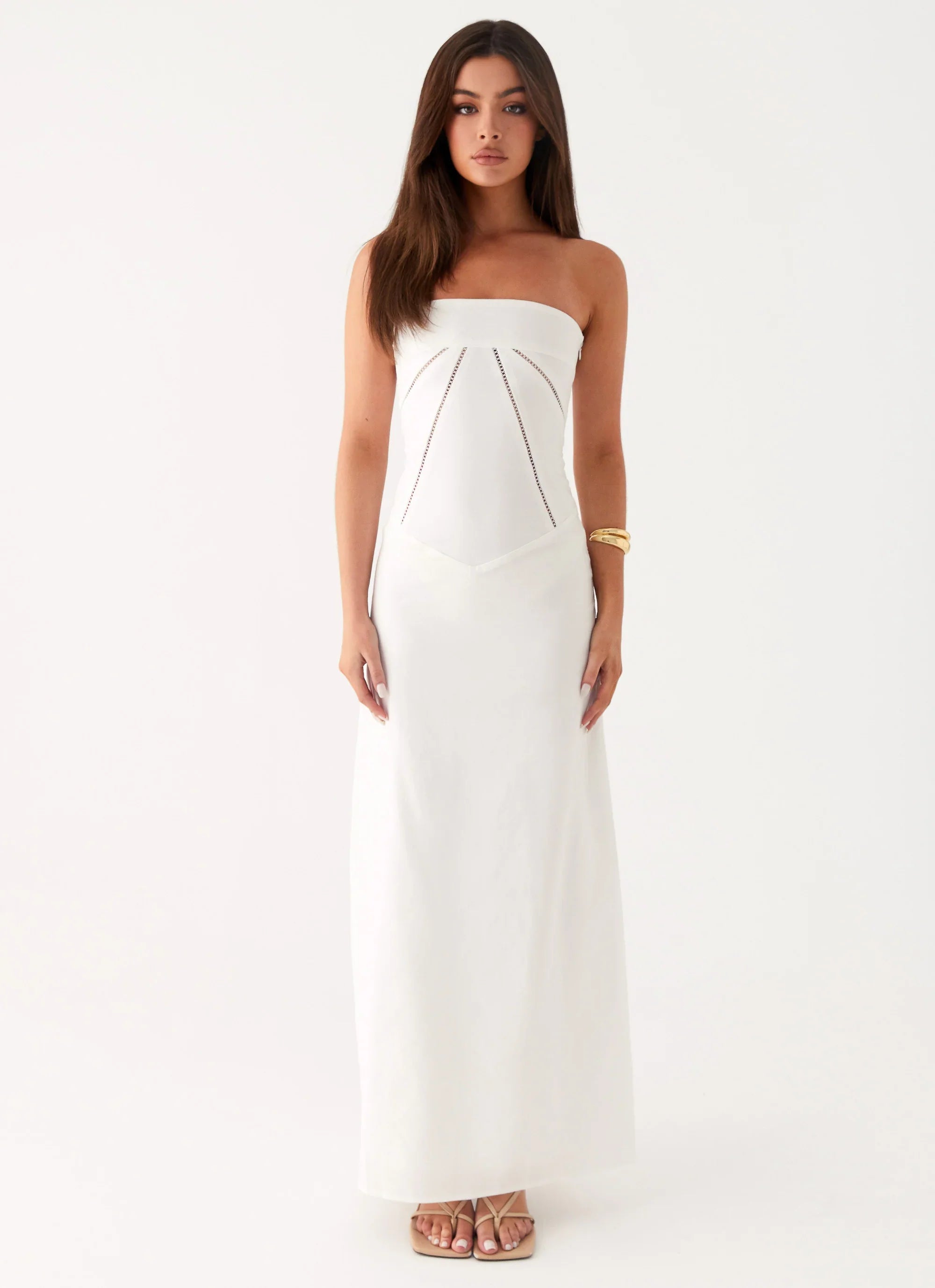 Embrace summer sophistication with the Cerisa Linen Maxi Dress. Featuring a chic strapless design, this dress exudes timeless elegance, allowing your shoulders to take centre stage. The panelling detail adds a touch of texture and visual interest, creating a flattering silhouette that accentuates your curves with grace.
