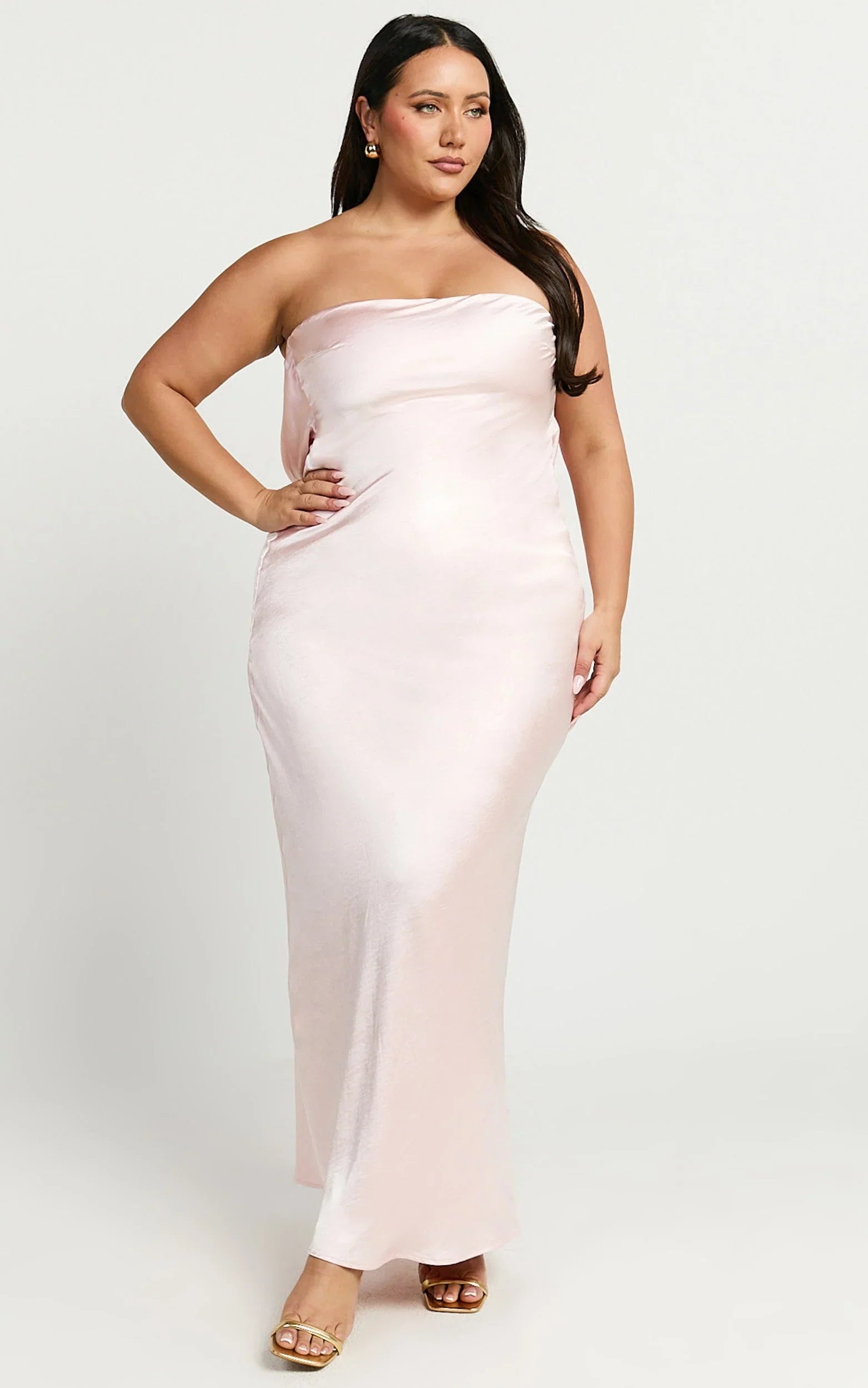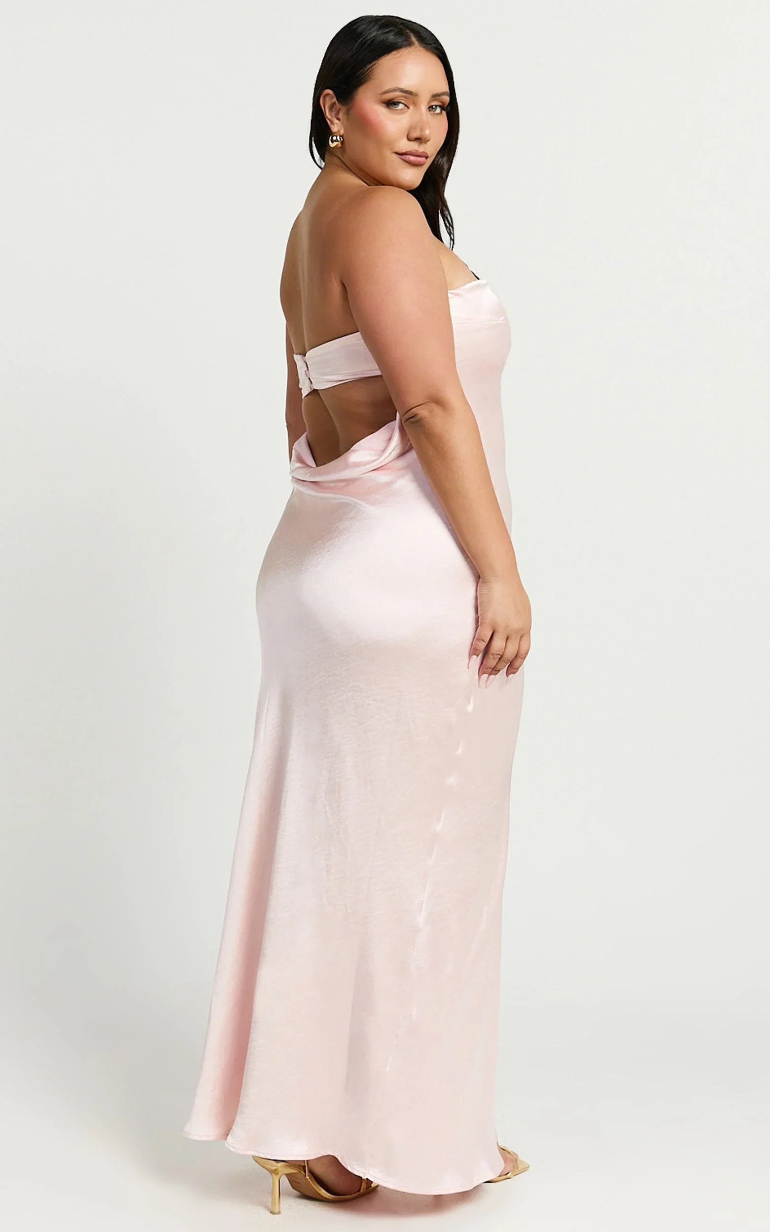 Stand out at your next special occasion in the stunning Charlita Maxi Dress. This strapless cowl back satin dress in pale pink is perfect for formal events, parties, or as a bridesmaid or wedding guest dress. Made from luxurious satin with a soft polyester lining, this dress will make you feel like a princess all night long.The strapless design showcases your shoulders and décolletage beautifully, while the cowl back adds an elegant touch of sophistication. The maxi length provides an effortlessly glamorous look that is sure to turn heads wherever you go.Designed with comfort in mind, the Charlita Maxi Dress features a slip-on style that hugs your curves just right without feeling restrictive. The soft satin fabric drapes gracefully over your body, creating a flattering silhouette that flatters every figure.Whether you're attending a black-tie event or celebrating a special occasion with friends and loved ones, this pale pink stunner is the perfect choice to make a lasting impression. Pair it with strappy
