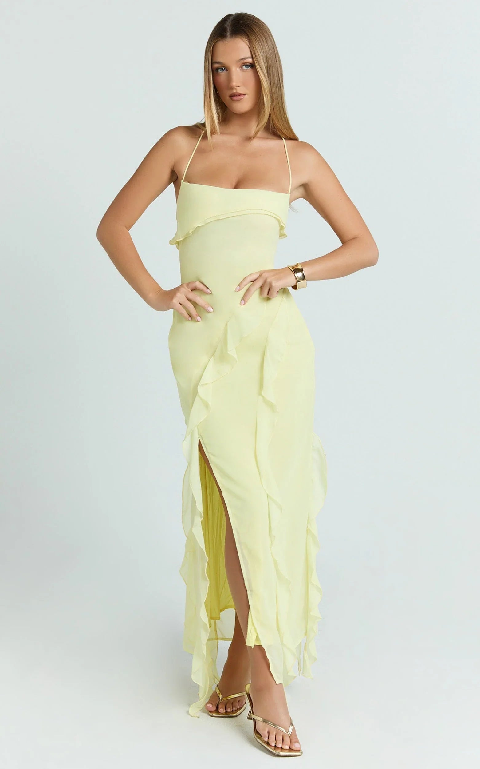 This yellow midi is your instant mood lift with flirty ruffle detailing and a curve-skimming silhouette that’s perfect for Dresses season. Butter yellow vibes meet soft movement through the skirt for a look that goes from brunch to dance floor without missing a beat. Style it with a pendant necklace and oversized sunglasses for a Sheer statement of summer ease.
