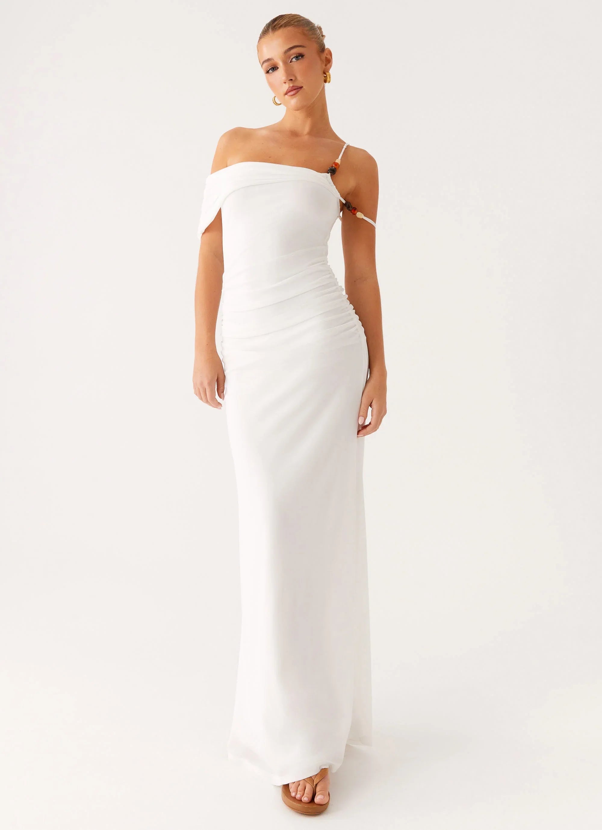 The Conquer Maxi Dress showcases an off-shoulder neckline with ruched detailing along the sides and shoulders. Crafted from stretch mesh fabric, this maxi-length dress blends elegance with a flattering fit.