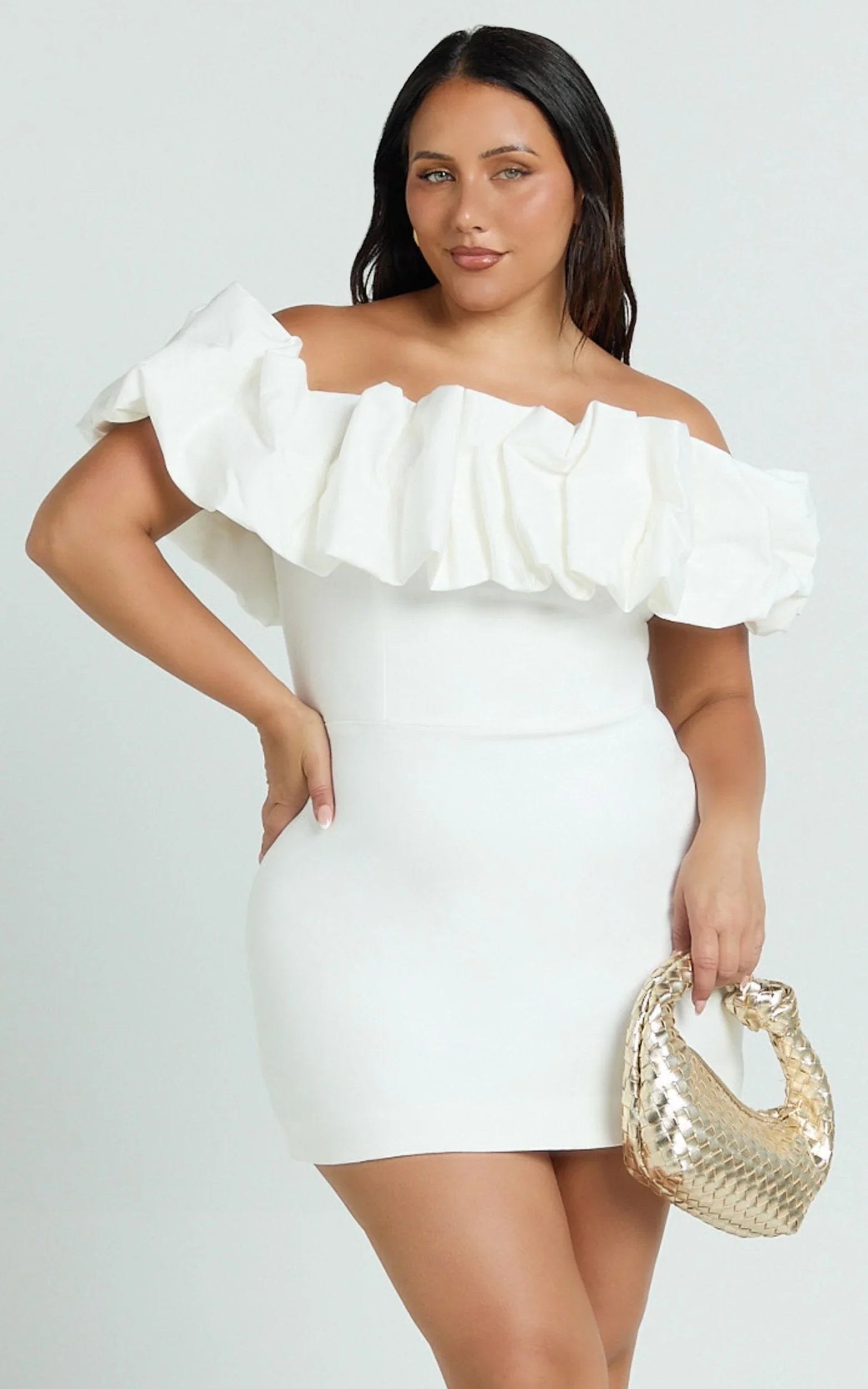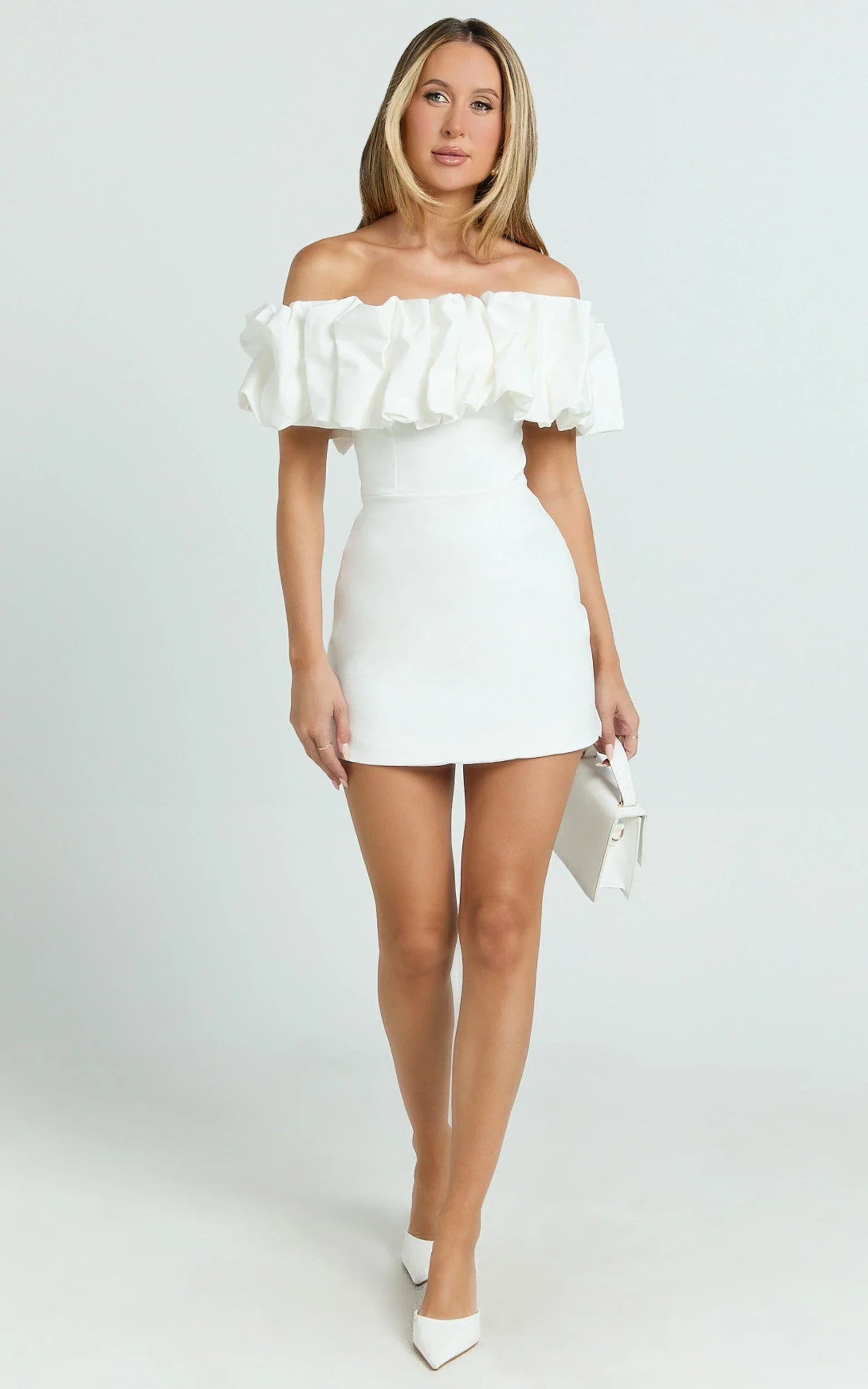 Coraline Mini Dress - Ruffle Off Shoulder Fitted Dress In White delivers that fresh Dresses moment while tapping into Bowcore romance and Transitional polish. Add delicate rosettes in your glam, sleek heeled flip-flops or thong sandals, and oversized sunglasses for a clean, modern finish. White keeps it versatile, just switch your accessories to take it from brunch to dance floor in seconds.