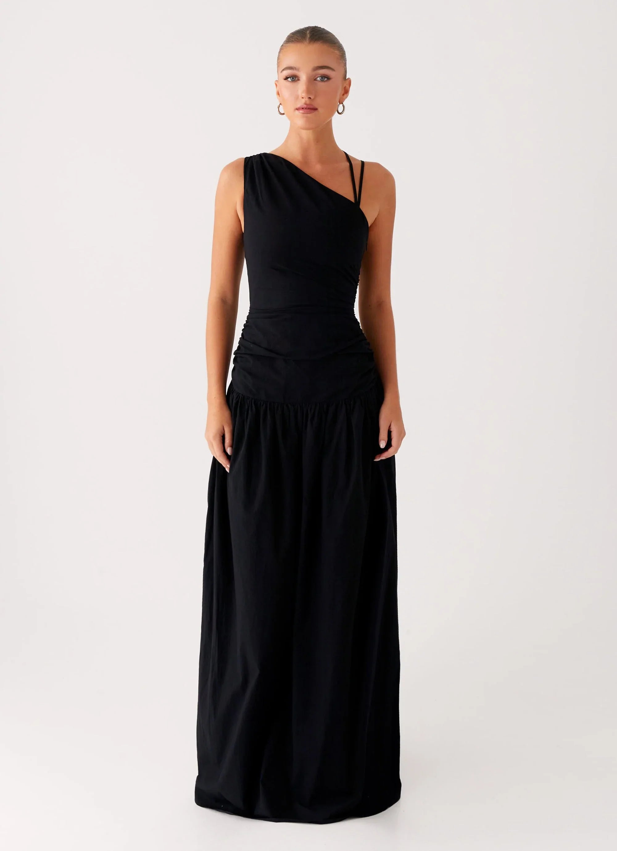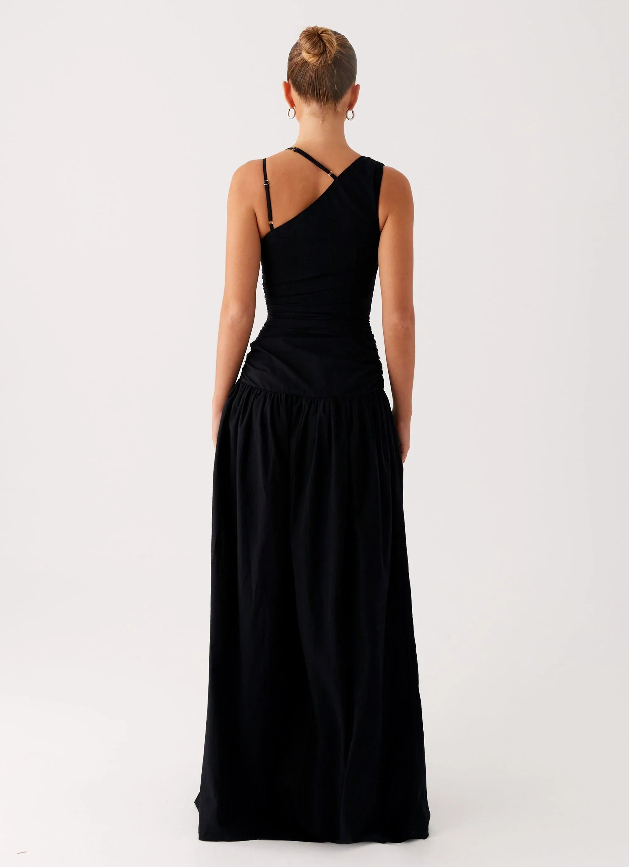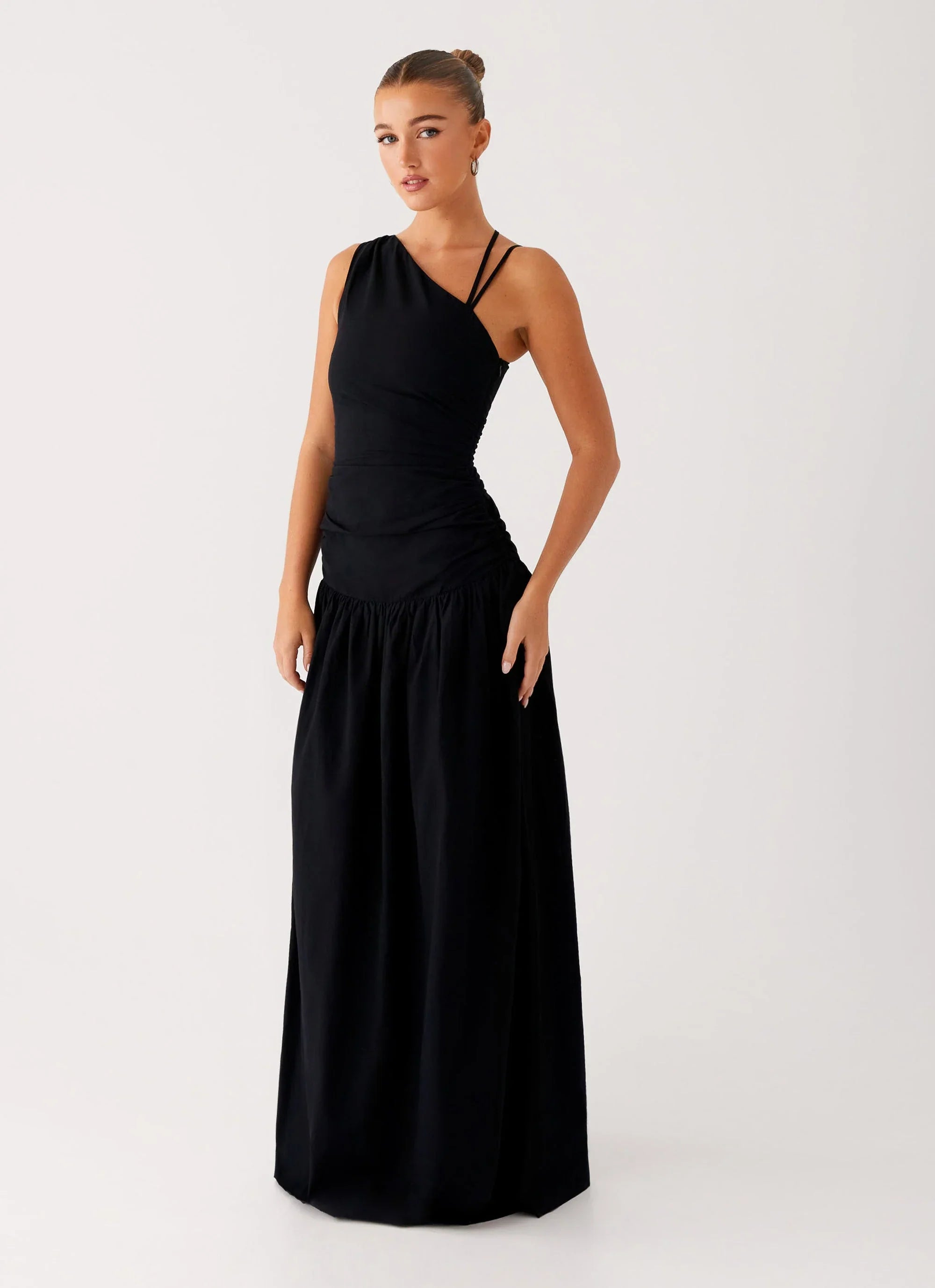 The Cortez Maxi Dress in black is sleek and sculpted with a one-shoulder neckline and adjustable strap. Featuring a fitted bodice, dropped waistline, and invisible side seam zipper, this maxi-length silhouette is made for elevated after-dark moments.