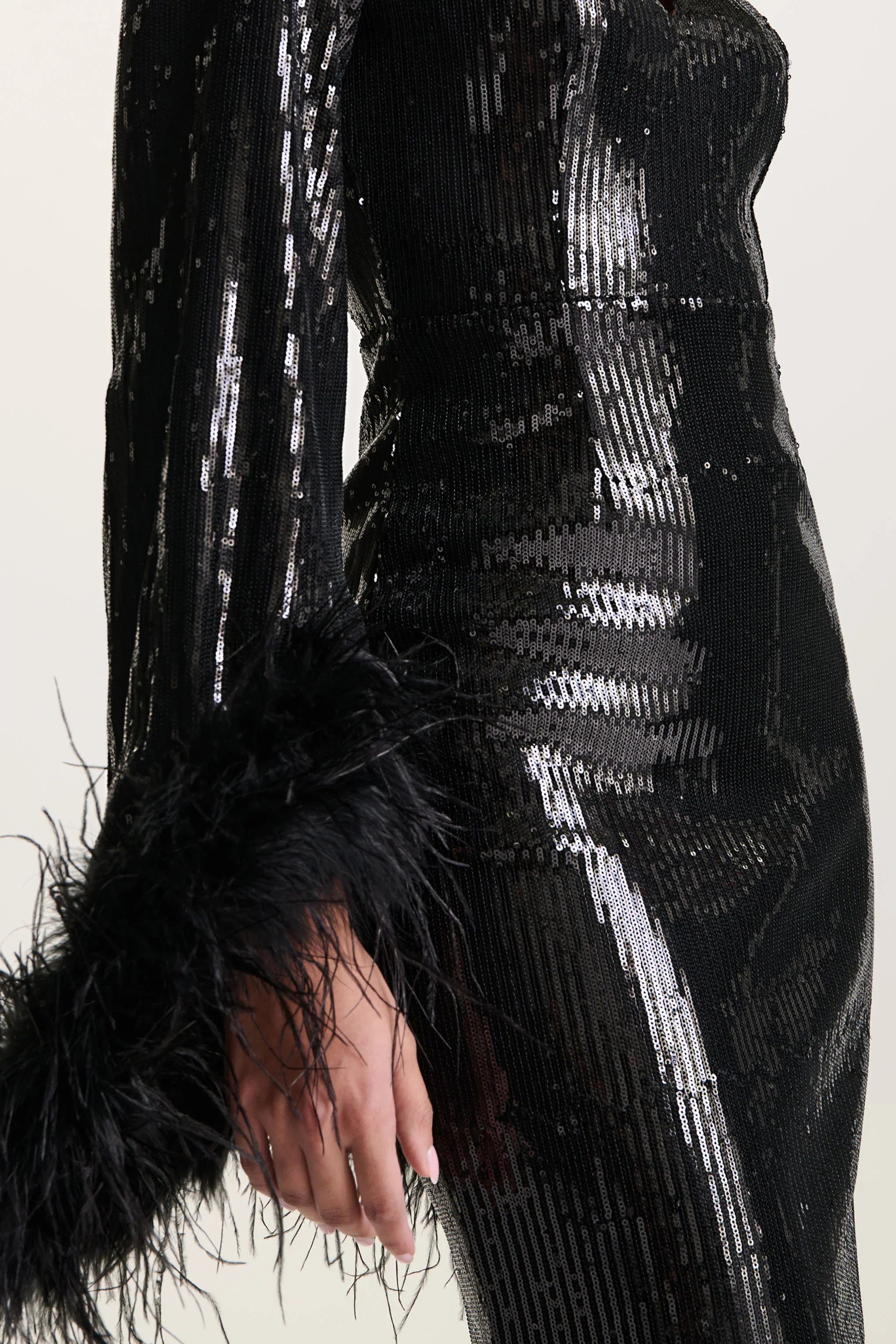 Scattered with light-catching sequins, Cosmic Star was designed to stand out. Designed for special occasions, this black maxi dress boasts a high neckline, keyhole cut-out and luxurious feather trimmed sleeves. Complete with a floor-sweeping train - whats not to adore with Cosmic Star?