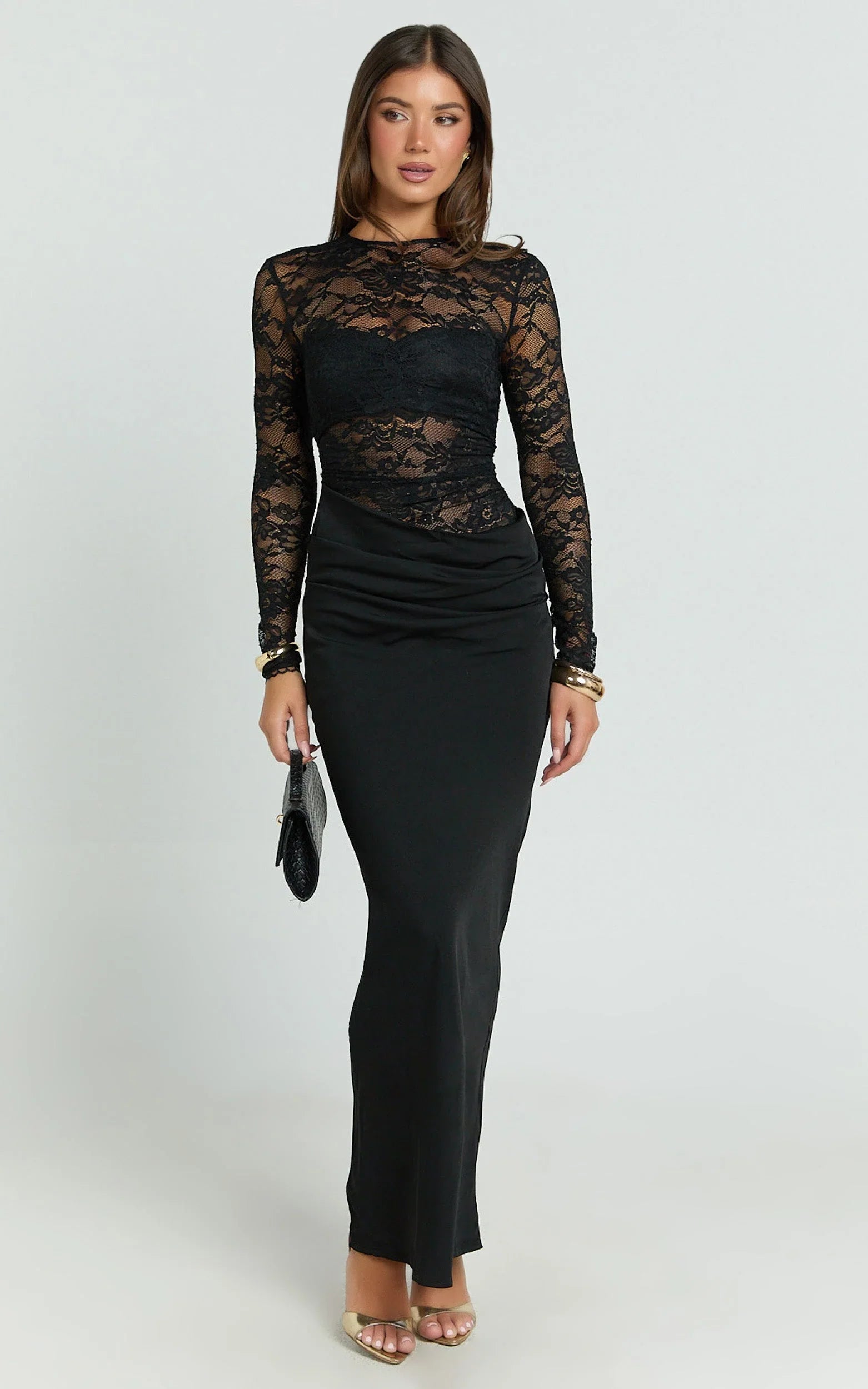 The Crisanta Maxi Dress in Black is all kinds of hot. The sheer lace sleeves and contrast paneling give it that sultry edge, while the bodycon fit smooths and sculpts in the best way. It’s sleek, dramatic, and made for nights when you plan on being noticed. Style it with strappy black heels and a bold lip for a clean, high-impact look, or add shoulder-grazing earrings and a slick bun to take it ultra glam. It’s your new go-to for fancy dinners, rooftop bars, and every RSVP that calls for a little mystery.
