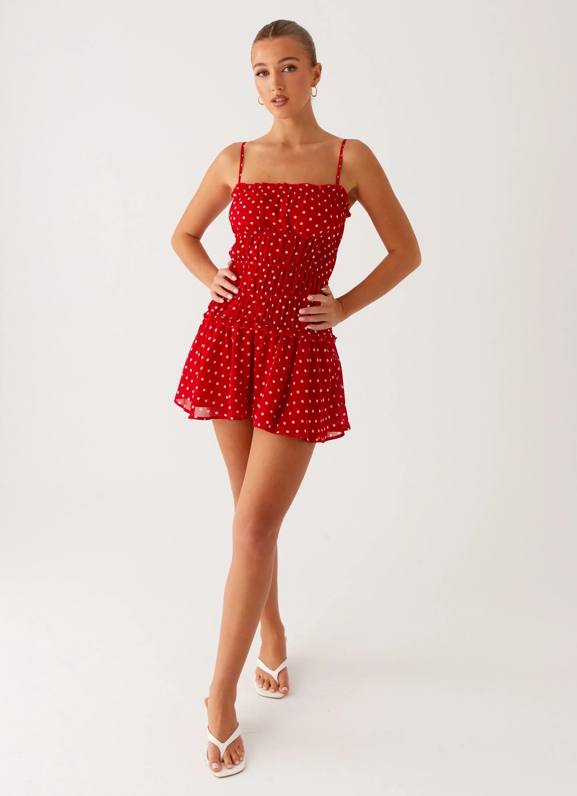 Bold, playful, and full of energy — the Cynlee Mini Dress in Red Polka Dot is made for nights that can’t be forgotten. With adjustable straps, a lined bodice, and elasticated ruching, this mini hugs your curves and keeps you moving through every moment.
