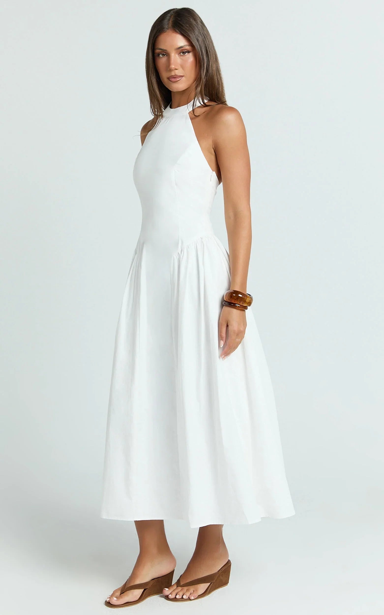 The Danielle Midi Dress in Off White is an elegant moment. The halter neckline highlights your shoulders, the cinched waist flatters your shape, and the fit-and-flare skirt moves beautifully with every step. Soft, polished, and so easy to style, it’s made for day parties, long lunches, and any event where you want to look refined without overthinking it. For styling, keep it simple and chic. Add layered pendant necklaces to draw attention to the neckline, then finish with strappy heels and a sleek clutch. If it gets chilly, drape a satin shawl or tailored blazer over your shoulders for evening polish. Timeless, flattering, and seriously wearable - Danielle is your effortless event dress.