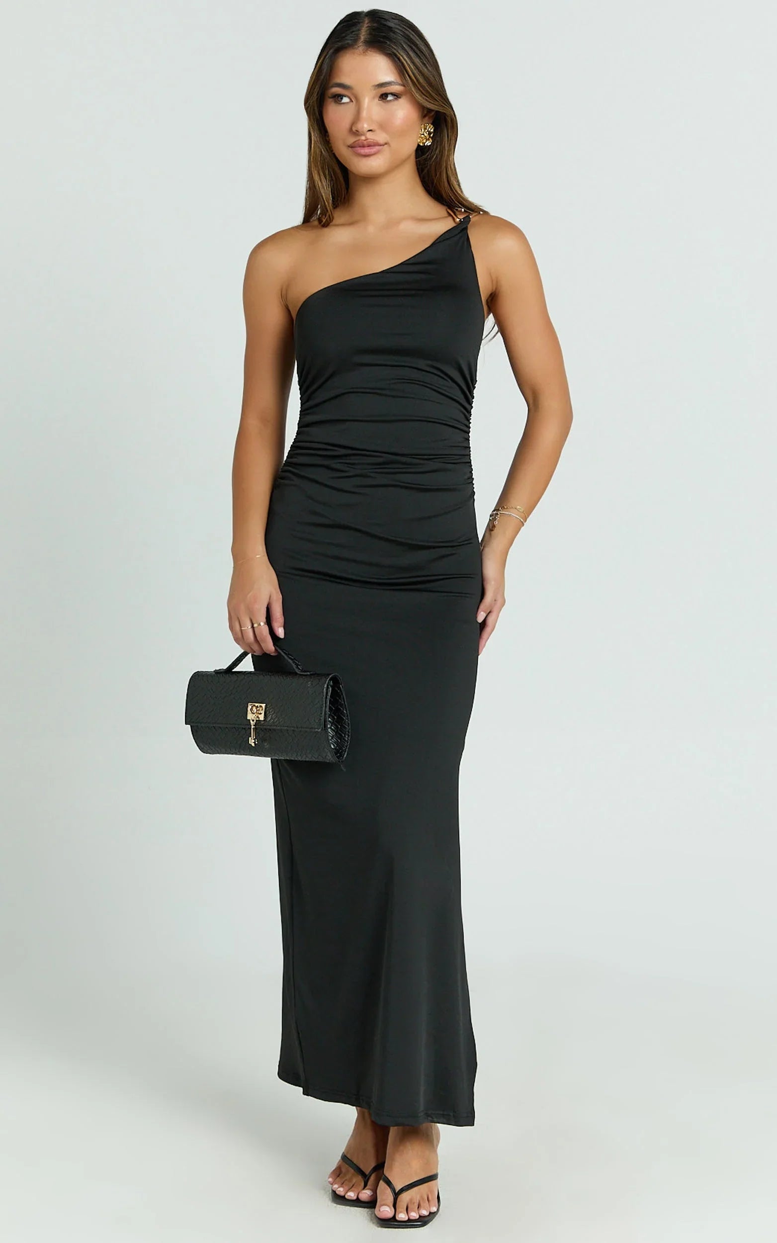 The asymmetric neckline and hardware detail sculpt an elongated silhouette, while the fluid black finish keeps it polished and ultra-flattering. A go-to for cocktail hours, weddings, and after-dark moments, this Dresses favourite balances clean lines with statement shine for instant confidence.