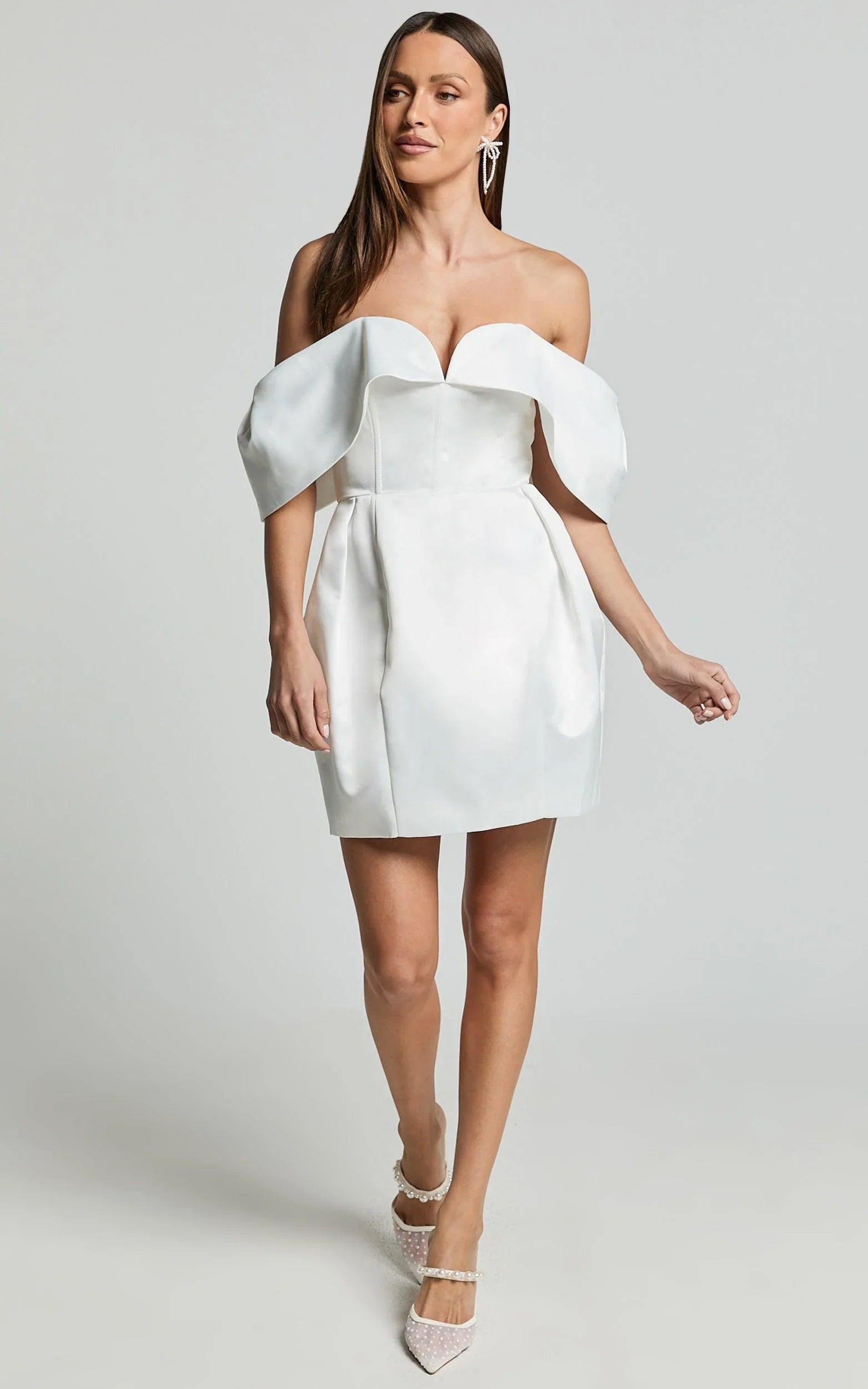 Make a statement in the Demelza Mini Dress – your next unforgettable look for any formal occasion. Crafted with a sophisticated V bar off-shoulder neckline, this strapless satin sensation merges timeless elegance with a dash of daring. Rendered in a luxurious ivory, the dress dances between the daring and the demure, making it the perfect pick for those who don't just walk into a room, but own it.