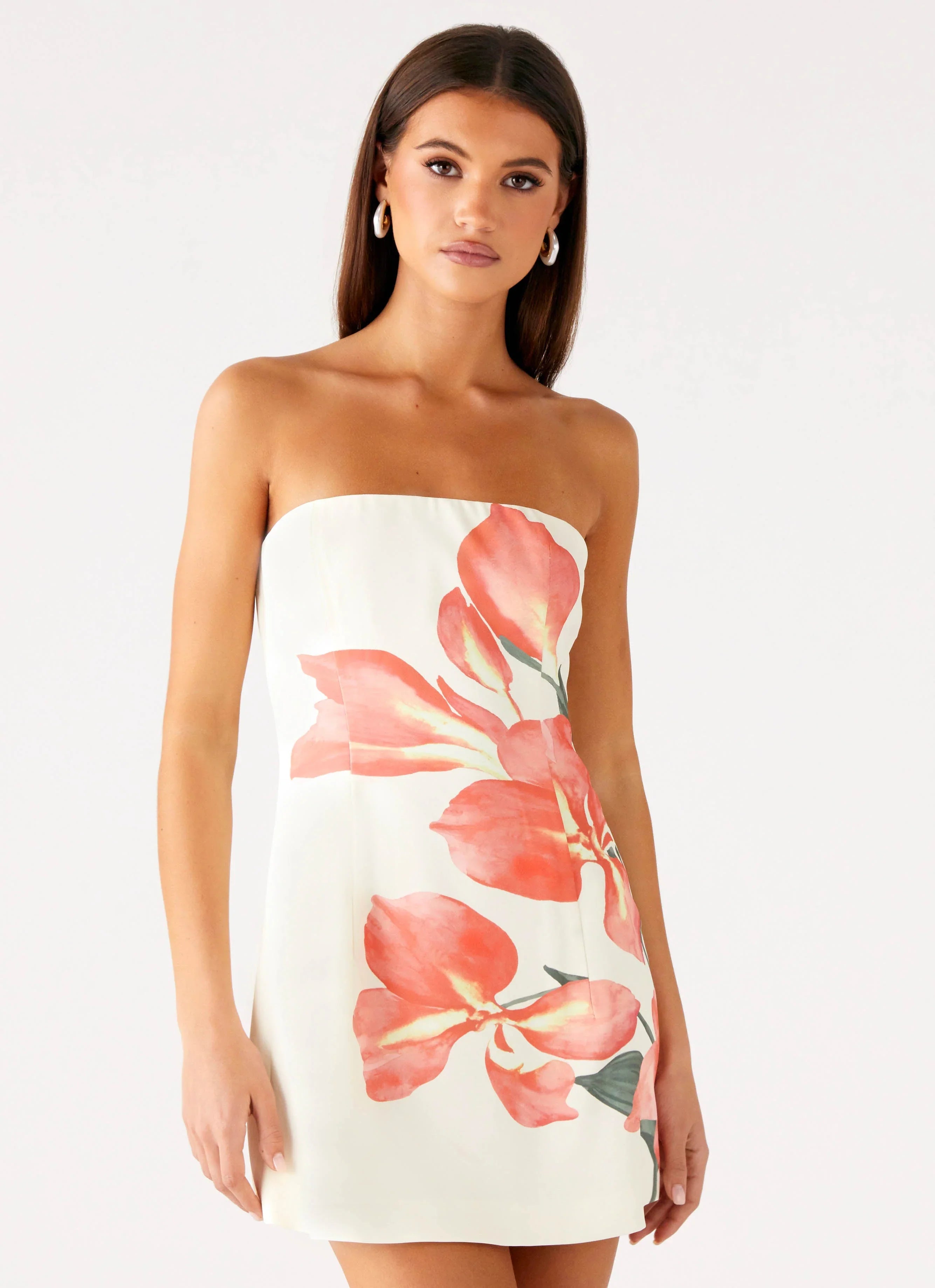 This strapless mini dress combines elegance with a contemporary twist, featuring silicone neckline taping to ensure a secure fit. The side hook-and-eye fastening and invisible zipper offer practicality, while the exclusive print and unique placement make this dress a must-have for your collection.