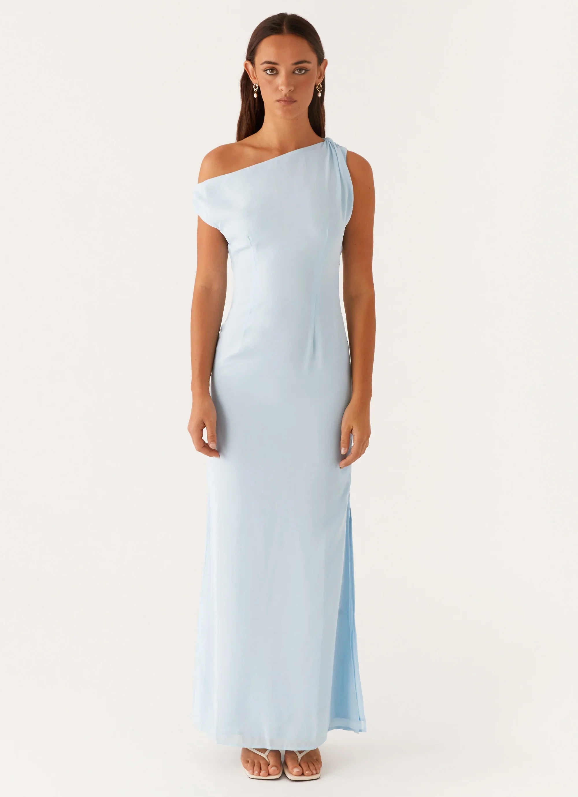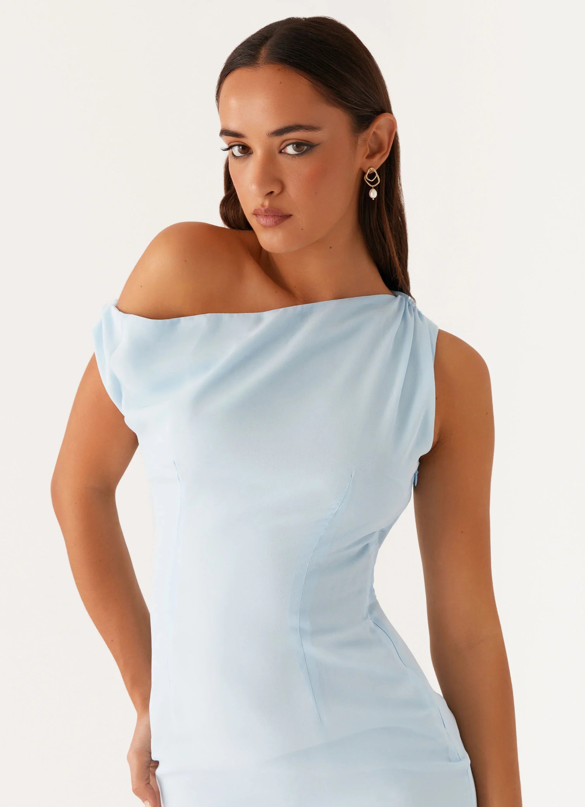 The Dinner Date Maxi Dress is a captivating silhouette with an off-shoulder neckline and elegantly pleated shoulders. Side splits bring a playful edge, ready for evenings under golden skies.