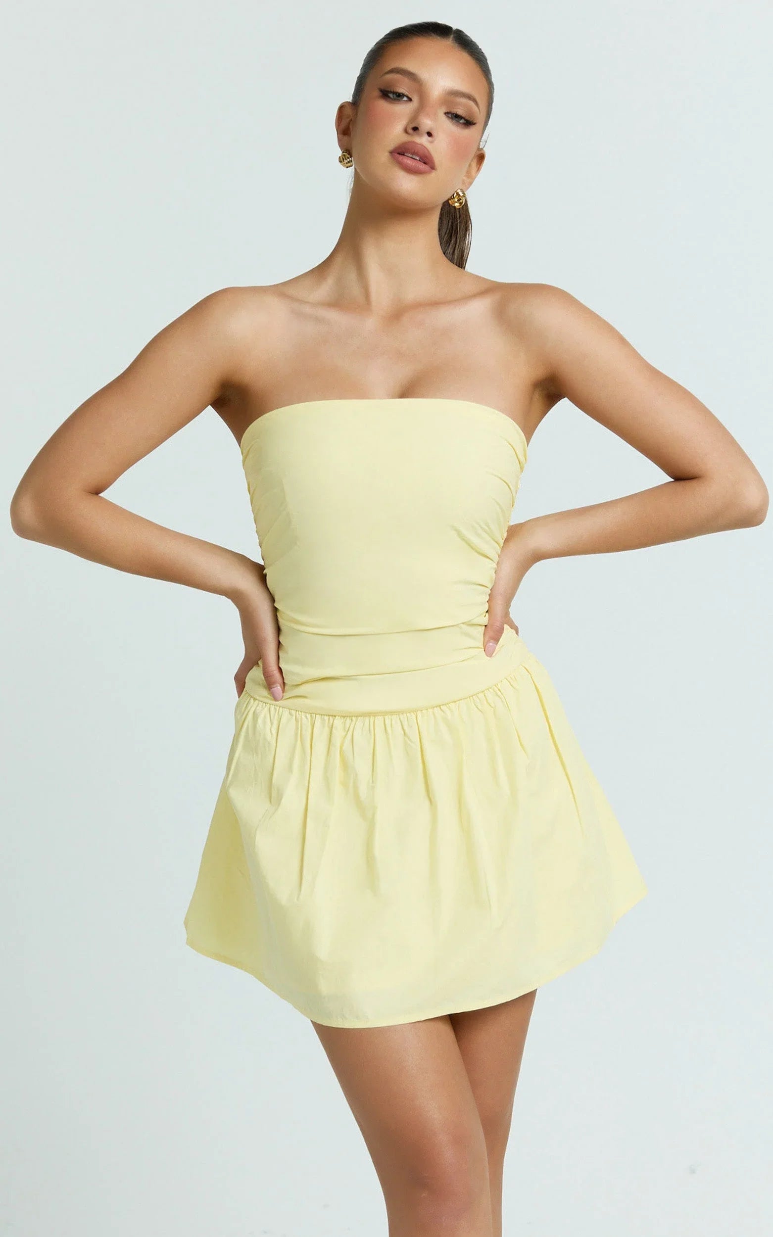 Meet Donatella Mini Dress - Strapless Drop Waist Dress In Lemon, your sunshine-soaked plus-one for parties and weekend plans. The sleek strapless neckline shows off shoulders, while the drop waist keeps it playful and modern. Style with barely-there heels and a cute clutch for cocktails, or add dainty hoops and a glossy lip for date night. Dresses that do the most with the least? This is the one.