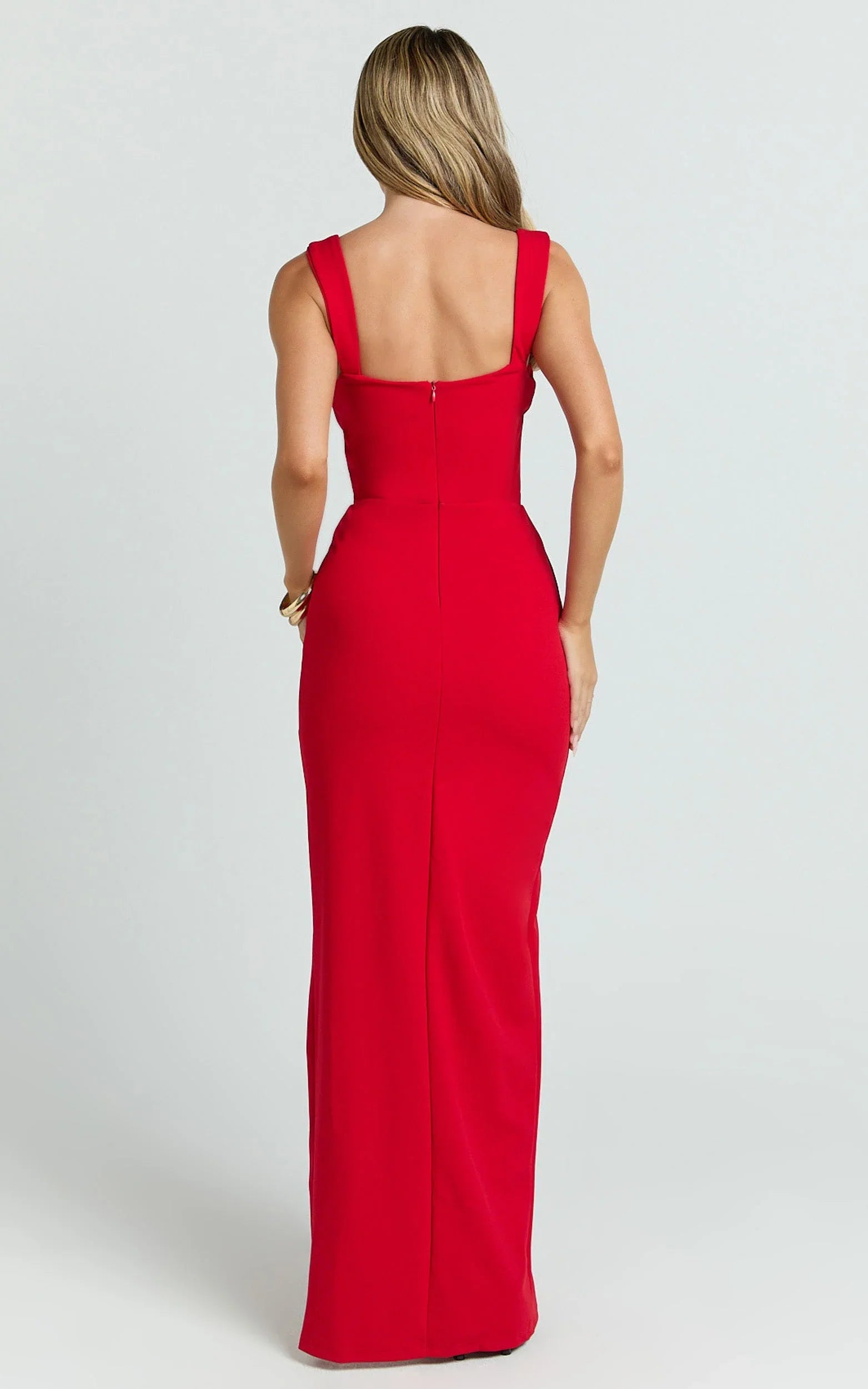 Meet the Donna Maxi Dress – Cowl Neck Column High Split Dress In Red: cut to elongate, drape to flatter and move with confidence. Lean into trending three-dimensional florals with statement earrings or a clutch, and balance the bold hue with barely-there thong sandals for a fresh, runway-to-real-life vibe.