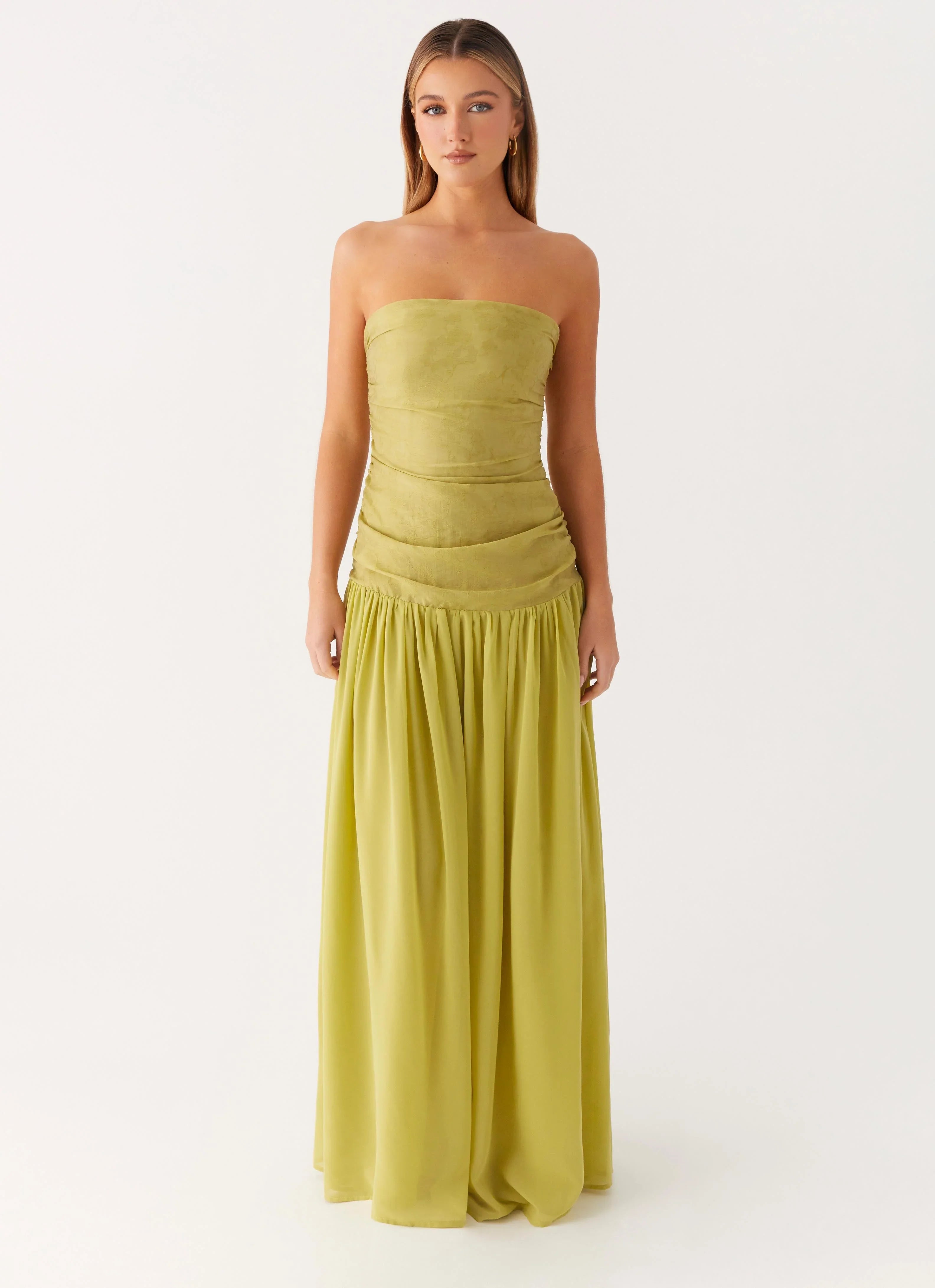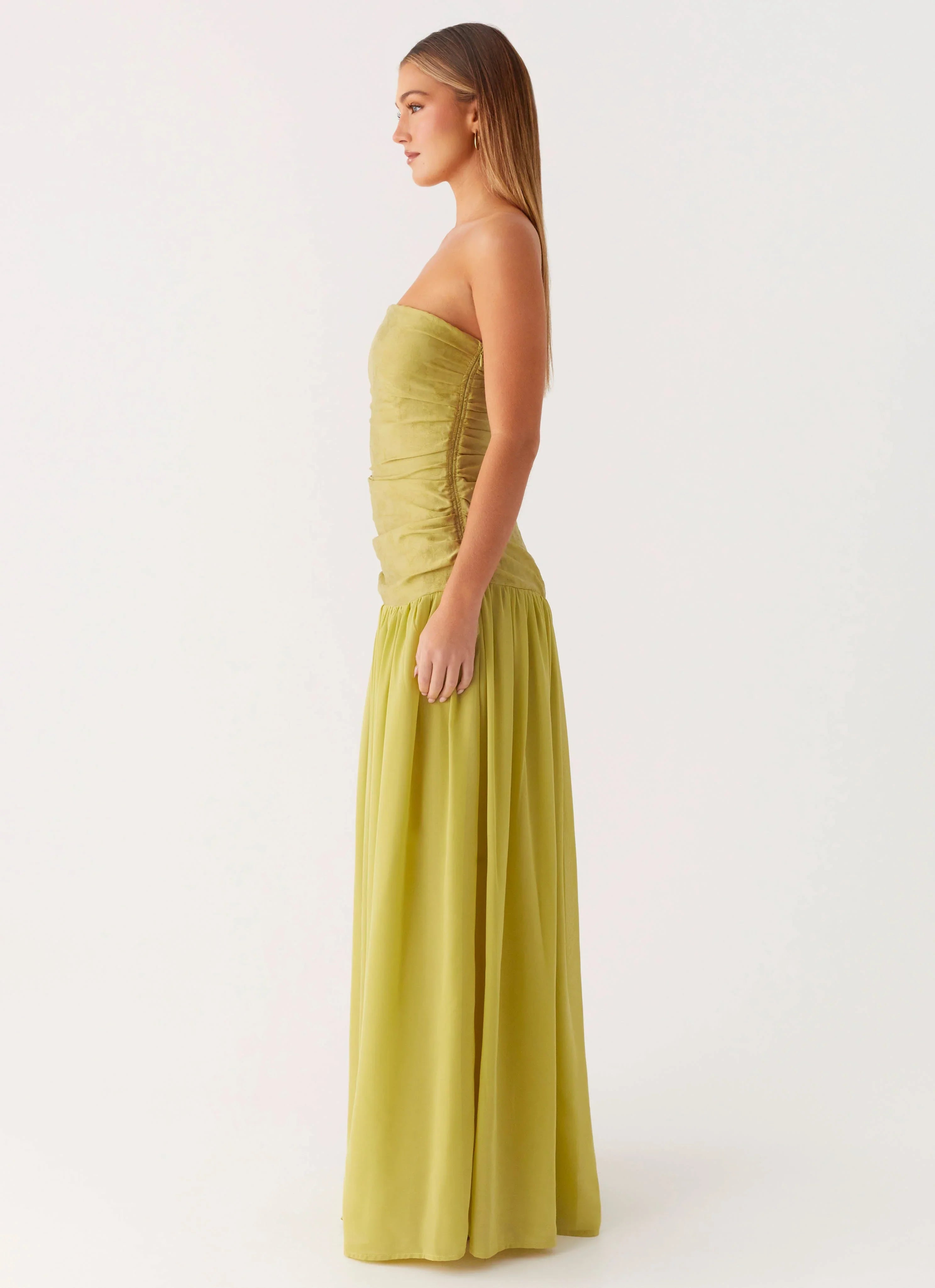 The Dreamer Maxi Dress is the definition of refined elegance. Featuring a strapless neckline with silicone taping for a secure fit, this fully lined style showcases ruched sides and an A-line skirt for a flattering silhouette that moves effortlessly through golden hours and beyond.