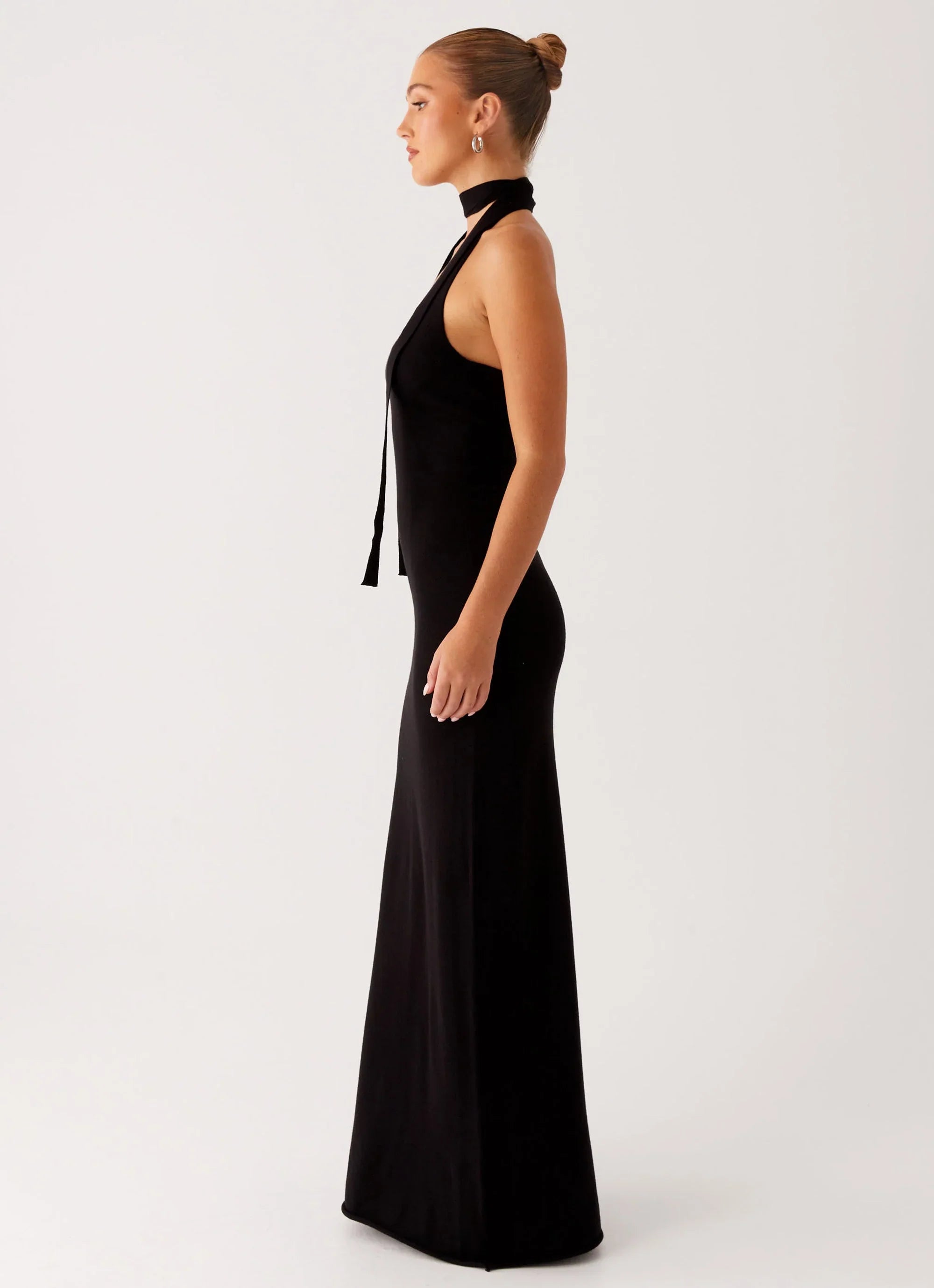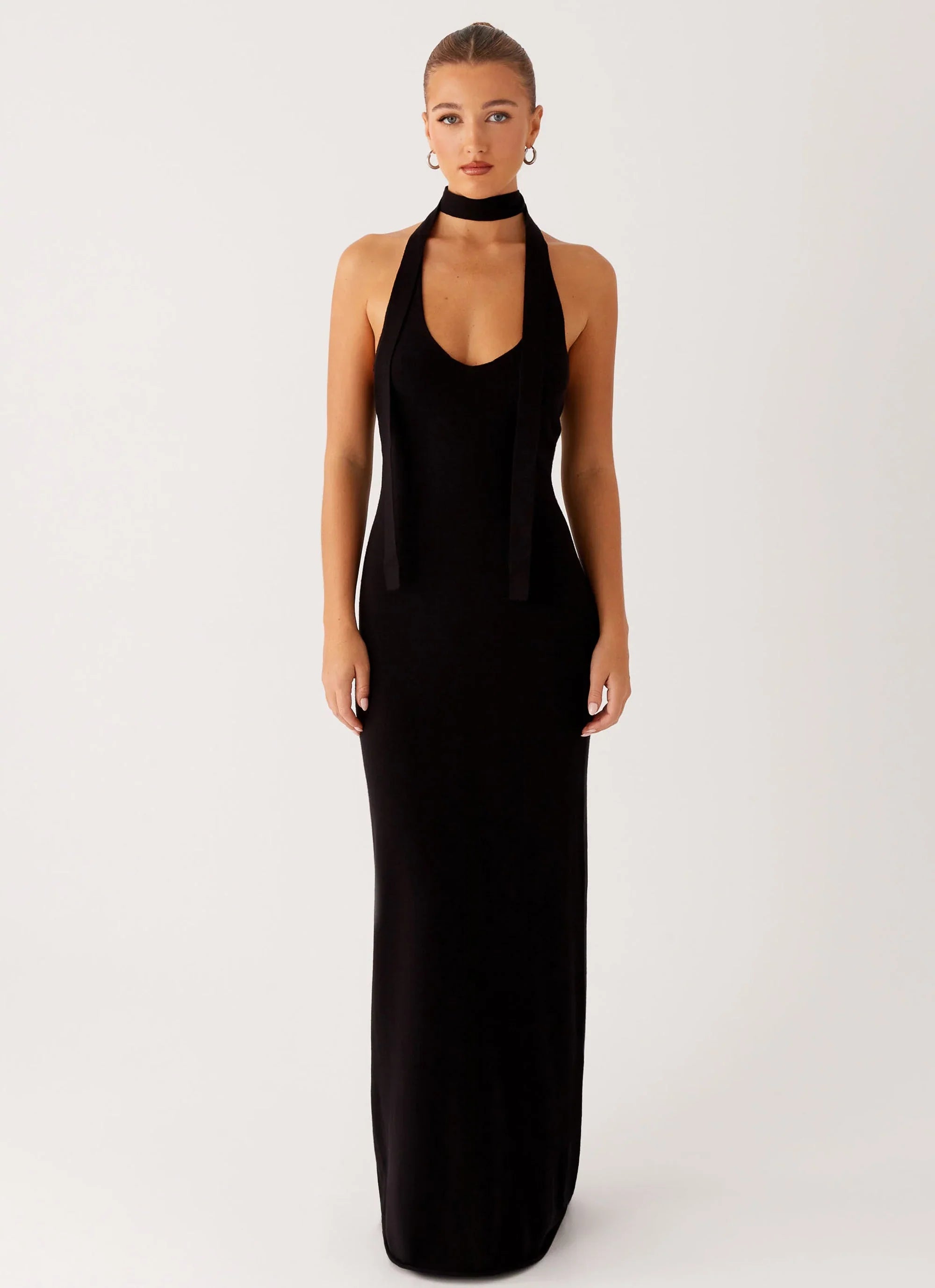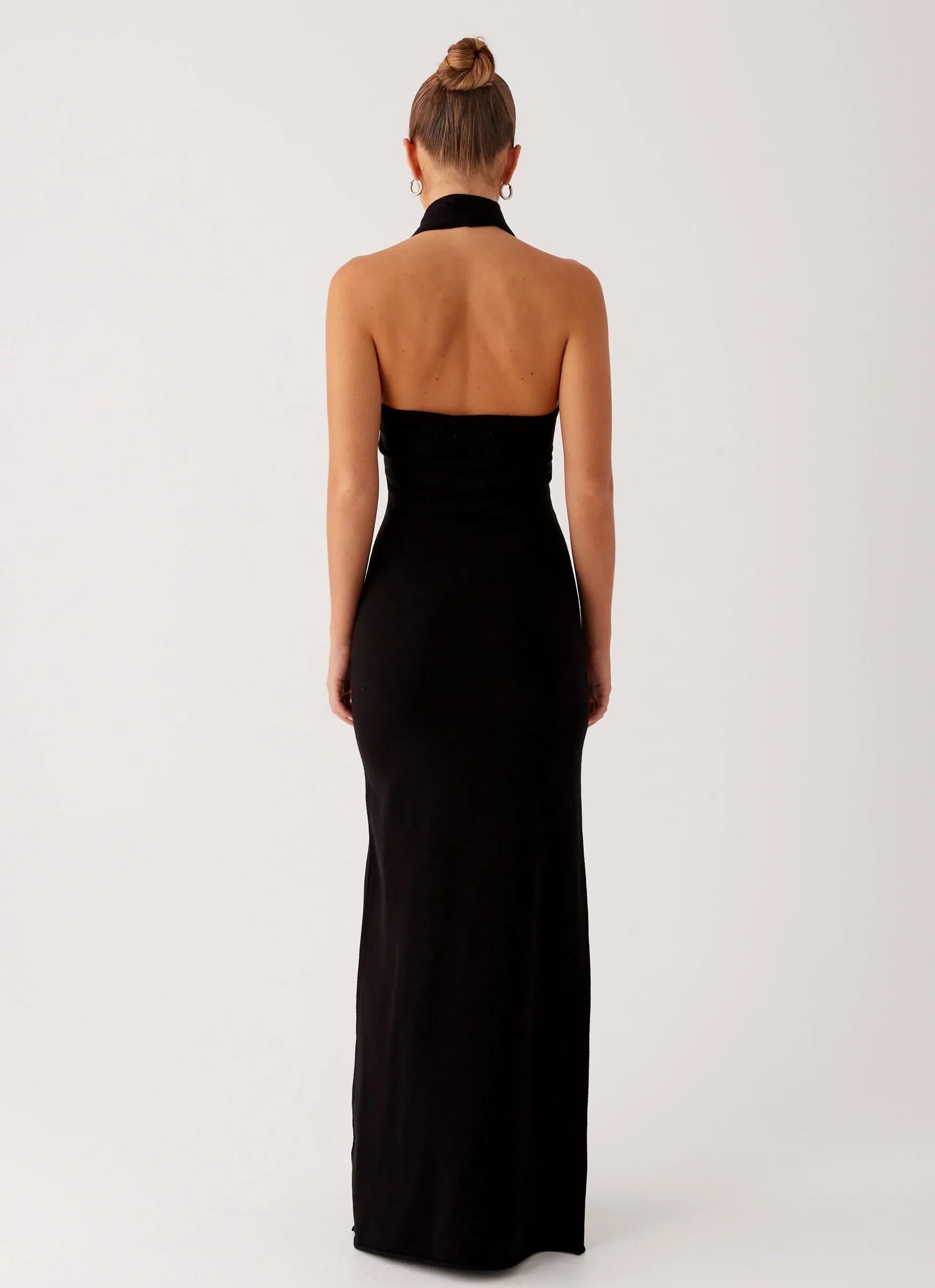 The Eddie Maxi Dress is effortlessly sleek in soft black stretch knit. Designed with a body-skimming silhouette and underlining for a smooth fit, it’s made to move with you from slow afternoons to after-hours.