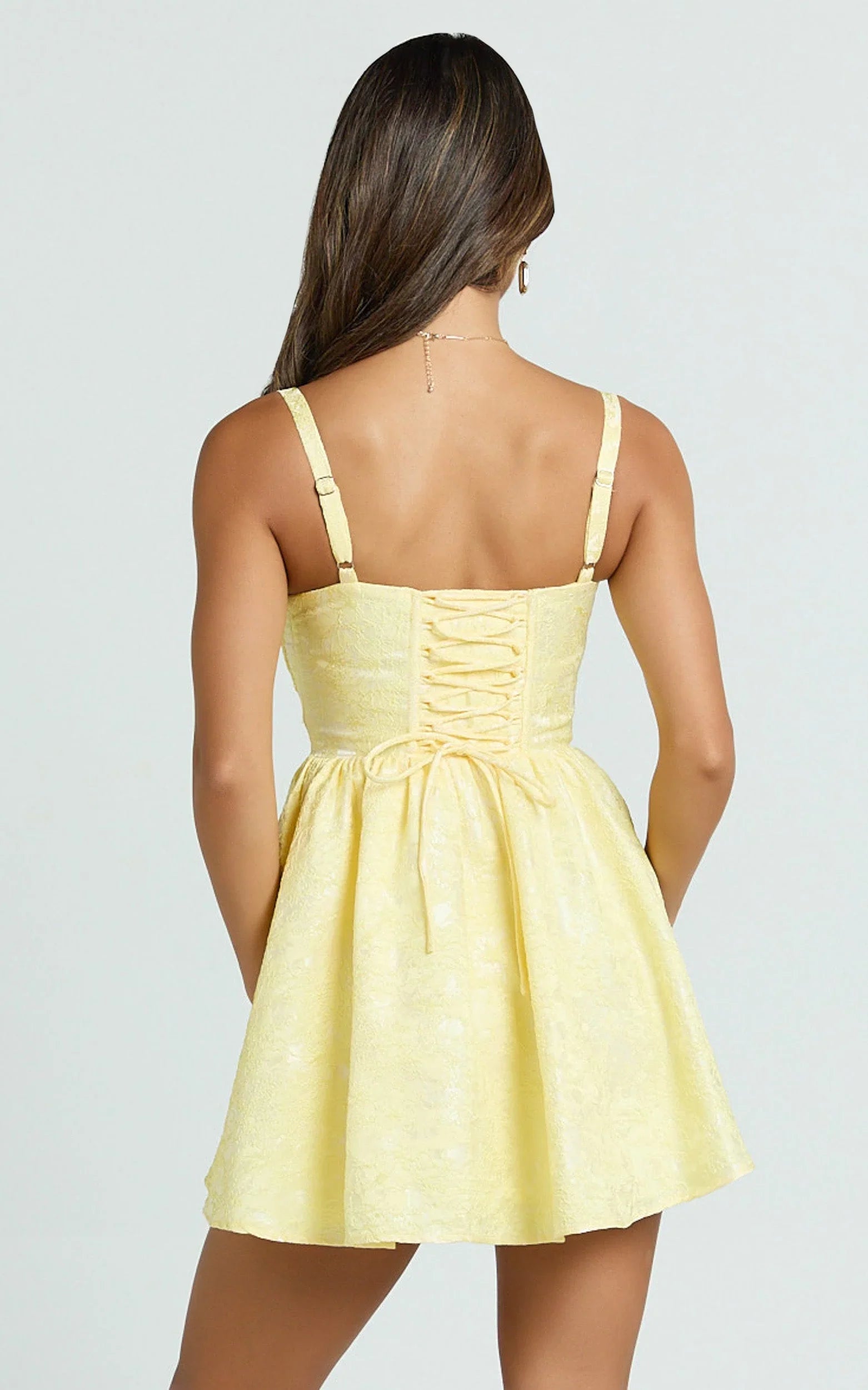 This jacquard mini serves a sweetheart neckline, lace-up bodice and a flirty fit-and-flare silhouette that snatches the waist and twirls on cue. The Yellow hue pops for parties, bottomless brunch, or any RSVP where cute Dresses take center stage, just zip, tie, and glow.