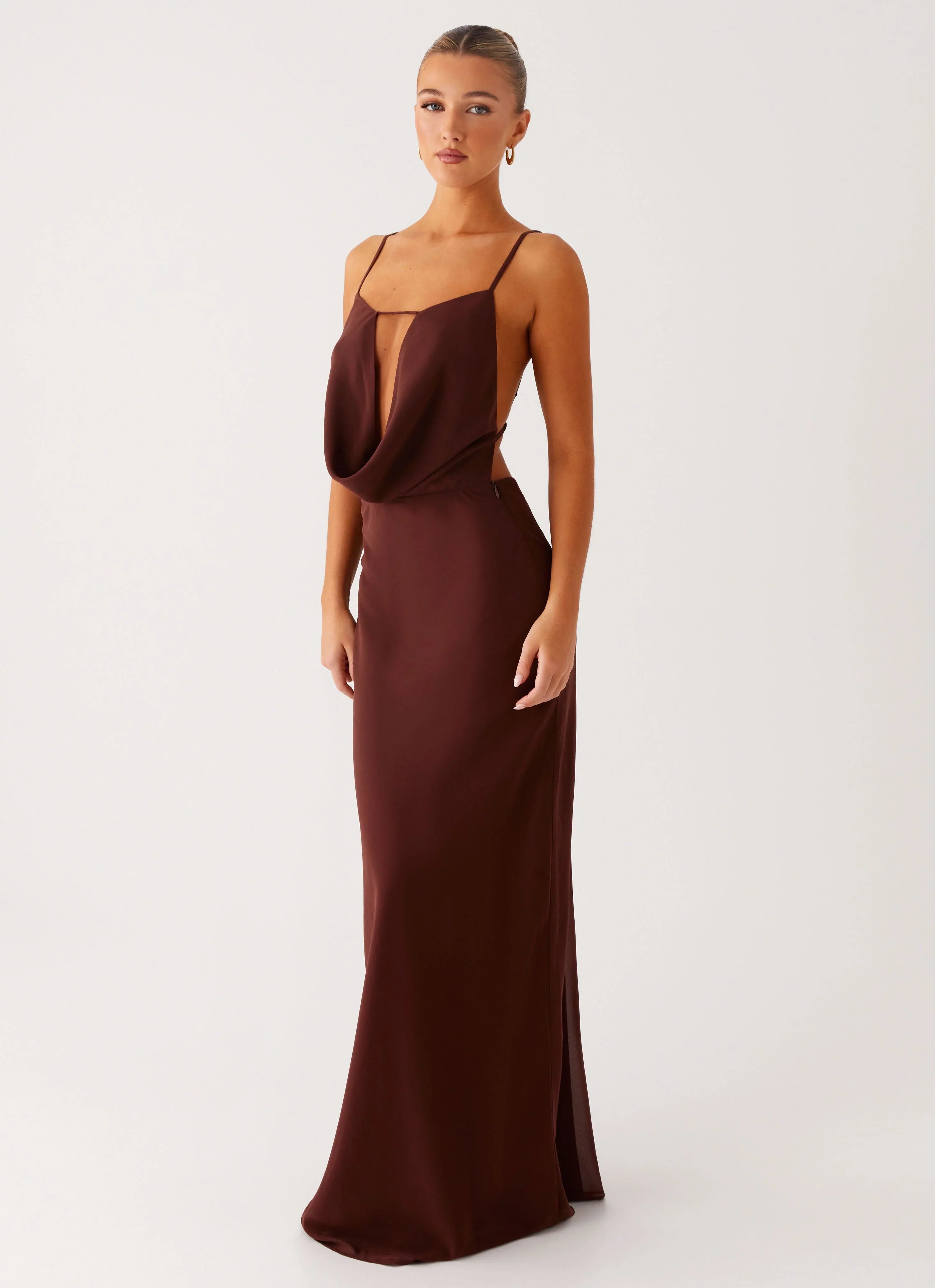 The Elation Cowl Neck Maxi Dress in chocolate brown is made for those who thrive as the sun sets. Featuring delicate thin straps, a low back with a back tie, and a semi-sheer finish, this dress effortlessly blends sultry and sophisticated. Perfect for evenings that stretch into unforgettable nights.