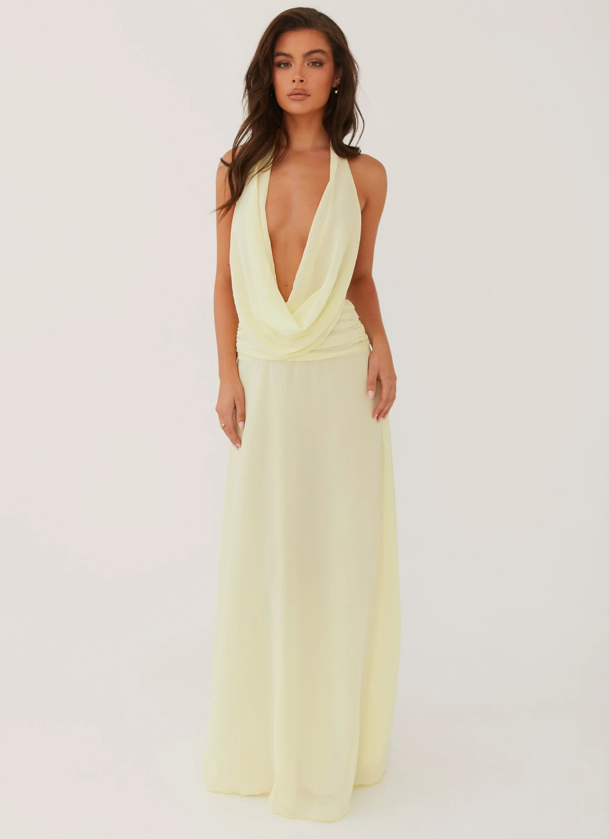 Illuminate the night in our Elysia Chiffon Maxi Dress. With its low cowl neckline and captivating open back, crafted from luxurious chiffon fabric, this dress radiates evening elegance. Pair it with heels and hoops for a dazzling look that lights up the nightclub scene.