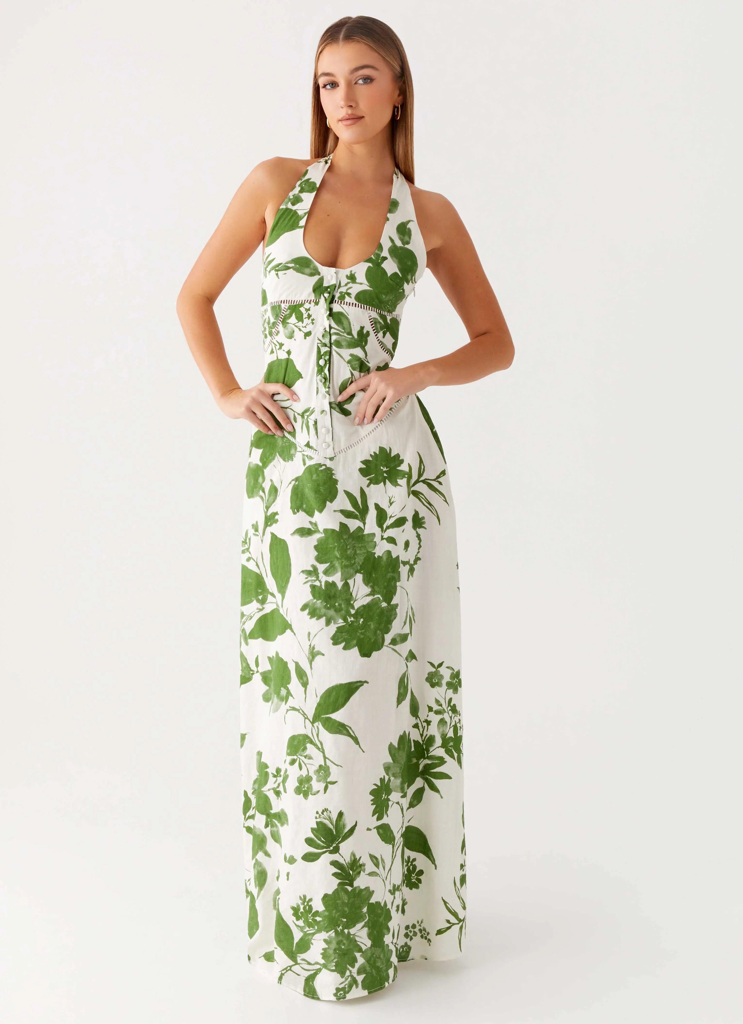 The Ember Valley Maxi Dress captures the essence of balmy nights. Featuring a V neckline with thick neck tie straps, front button embellishment, and an A-line skirt, this fully lined dress is crafted in our exclusive print for effortless evening elegance.