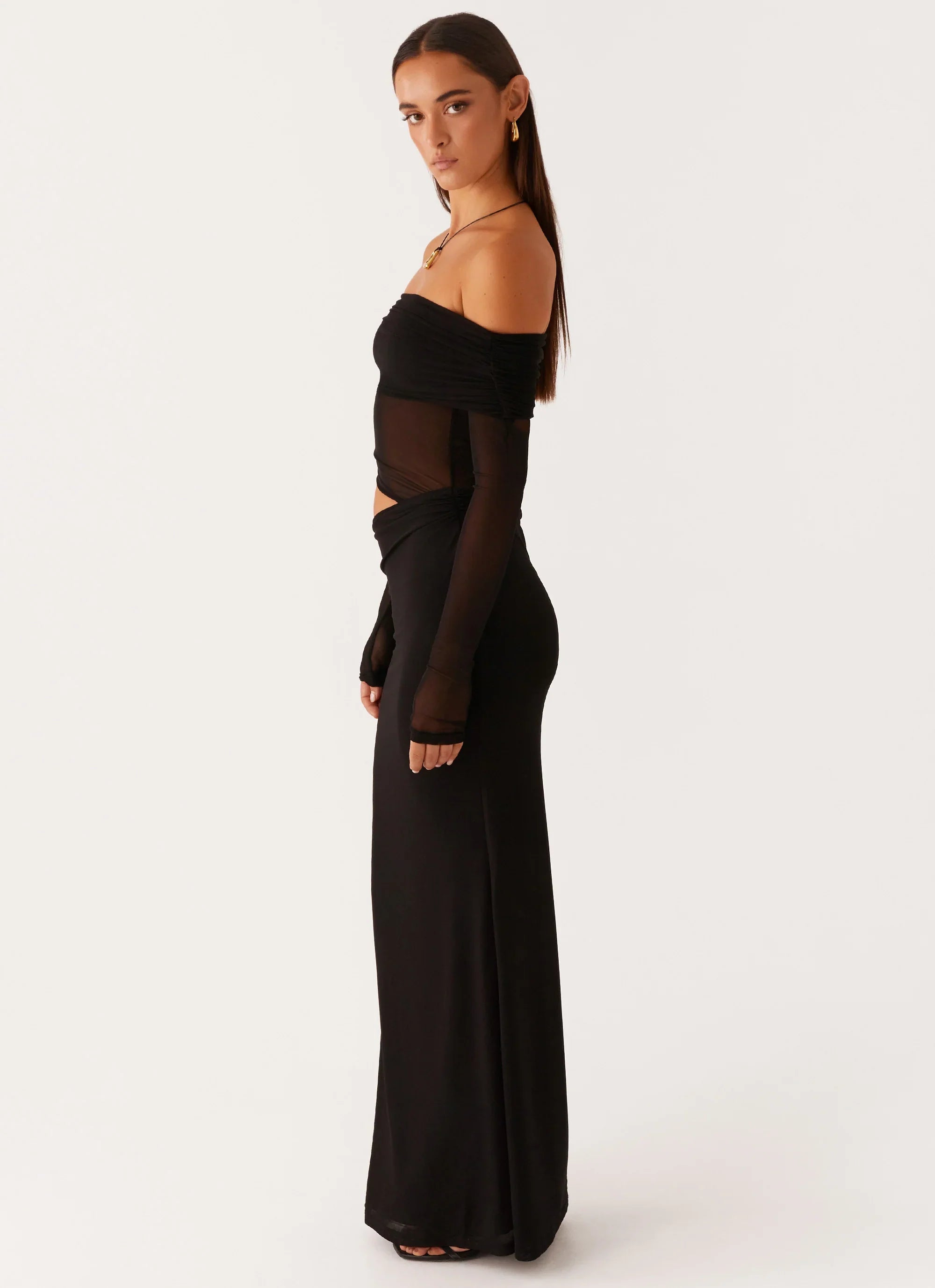 The Emery Maxi Dress is a stunning blend of elegance and bold design. With an off-shoulder neckline that beautifully frames the shoulders, it exudes a chic, feminine vibe. The side cut-outs add a daring touch, while the stretch mesh fabric ensures a flattering, comfortable fit.